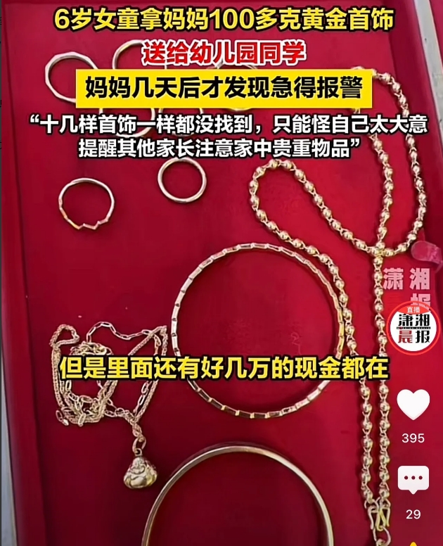 小童也爽快的承认了,称这些首饰都拿到幼儿园分给了同学,于是,方女士赶紧报了警,又来到幼儿园调取了监控,由于小童是分批拿走的,时间也比较久了,所以监控中看不到小童到底分给谁了。