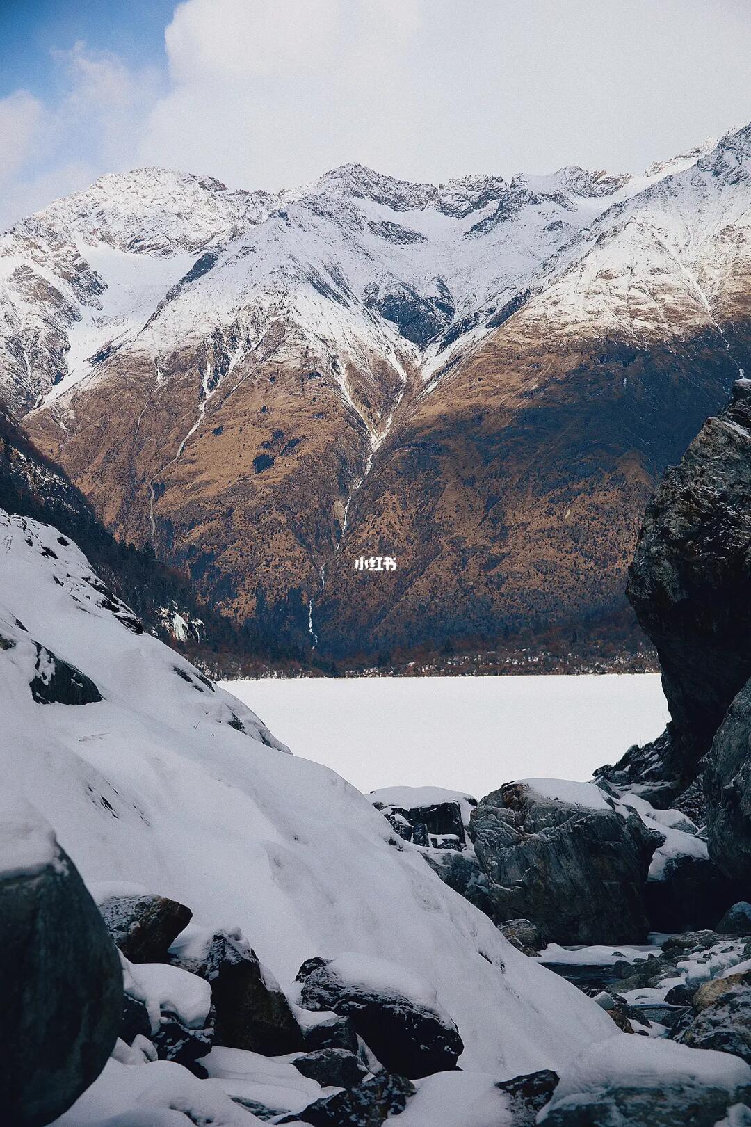●哈巴措湖面雪覆盖到脚踝,平常走的贼快的平路,却被这大雪拖慢了速度,永远走不到头似的.我们小心翼翼的踩着石头经过两湖之间的河流,转弯抬头一看,还是无尽的雪原,冰川那么近又那么远.