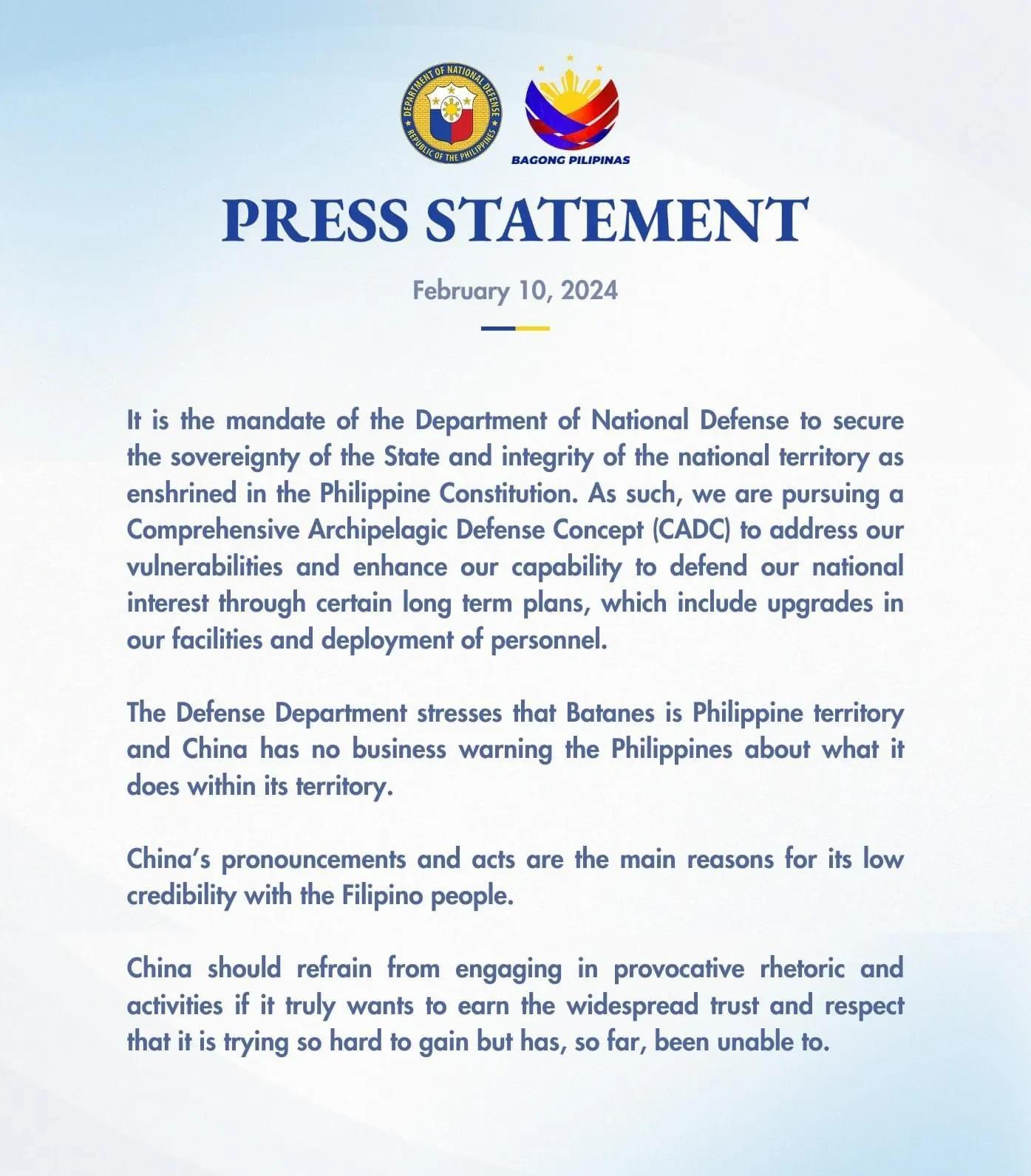 而在昨天菲律宾国防部正式对外发布的这份声明中,回应了中国外交部此前对菲律宾的批评!声明称:巴丹群岛是菲律宾的领土,菲律宾在巴丹群岛上增加军事部署,这和中国没有任何关系,中国也无权进行干涉和指责!声明还进一步指责中国称:如果中国想得到菲律宾的尊重,就必须谨言慎行!