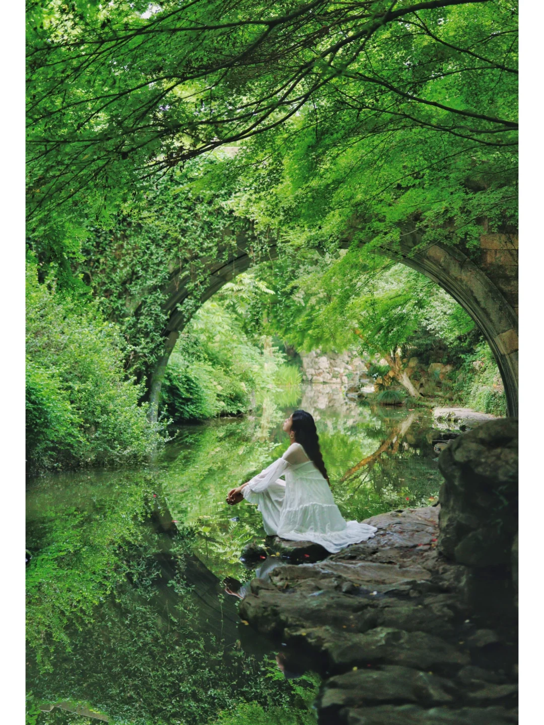 很多人都不知道的小众景点,往里走是满眼绿色,拱桥前小河水流过~