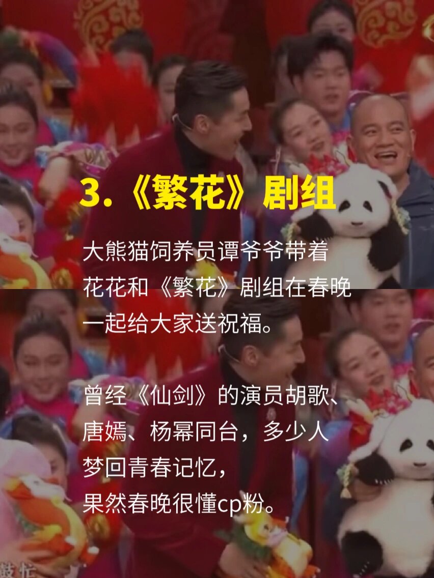 3.大熊猫饲养员谭爷爷带着花花和《繁花》剧组在春晚一起给大家送祝福。