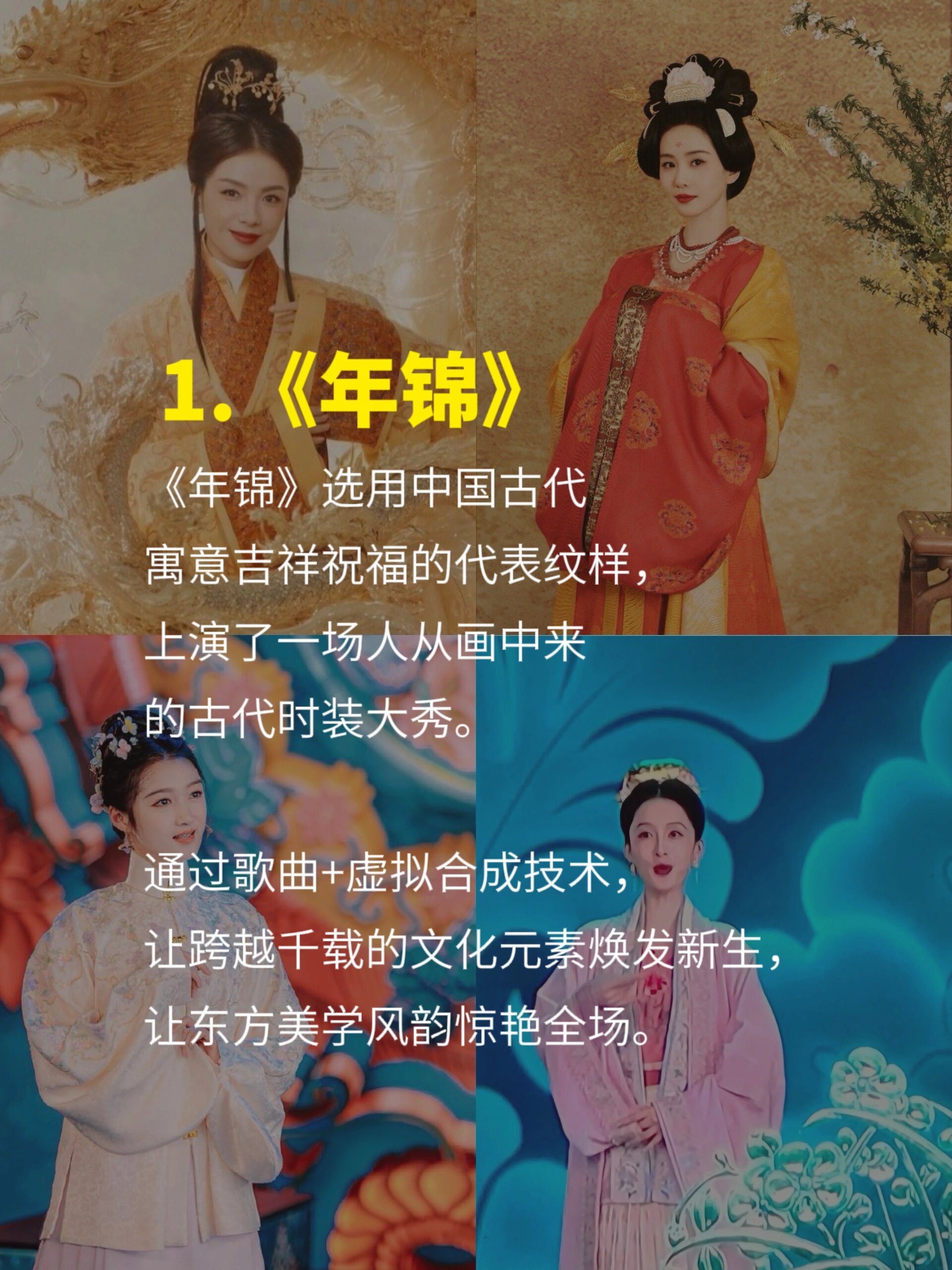 1.《年锦》选用中国古代寓意吉祥祝福的代表纹样,上演了一场人从画中来的古代时装大秀