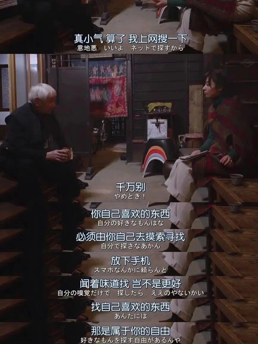 📺《在京都小住》 “20多岁的年纪,没有工作、对未来迷茫、单身,我的人生真的非常失败吗?” 也没有吧,人这一生一定要有所成就吗?活在当下就好了吧。 去一个地方一定要做攻略,一定要吃当地的美食,一定要听别人的推荐吗? 其实我很不喜欢为了去哪而做攻略,为了吃什么而去问很多人这个究竟好不好吃。去了一个地方我首先想到的是放松,而不是为了打卡,我不喜欢有目的的去做某件事,真的。 佳奈问舅公,附近都有什么好吃的,让舅公推荐,舅公则说让她自己去发掘。 所以,无论做什么都不要只是听说,而是自己去亲身经历。