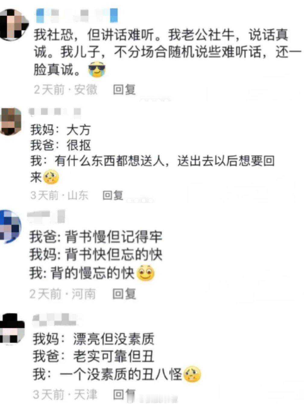 [并不简单]我妈脾气大又抠又怂说话还阴阳怪气 [并不简单]我爸大方,一般沉默寡言出口就直击要害 我:大方,脾气也很大的说话直击要害[哭笑不得]继承了我妈的暴脾气但是其它为人处事我自成一派