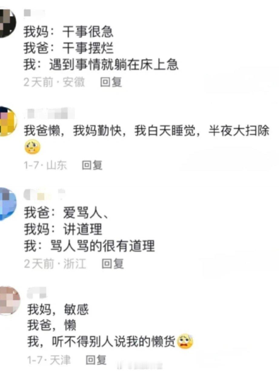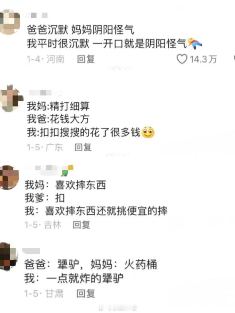 皮卡秋 2024-02-15 13:32 [并不简单]我妈脾气大又抠又怂说话还阴阳怪气 [并不简单]我爸大方,一般沉默寡言出口就直击要害 我:大方,脾气也很大的说话直击要害[哭笑不得]继承了我妈的暴脾气但是其它为人处事我自成一派