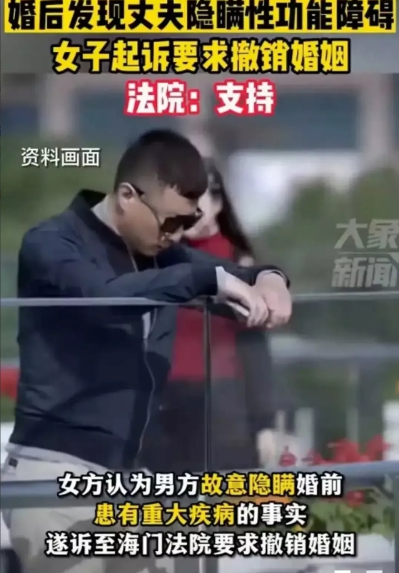 “这跟守寡有什么区别!”江苏,一女子结婚一个月了,丈夫却以各种理由拒绝夫 妻生活。女子觉得不对劲,便以正常体检为由,带丈夫去医院检查,结果显示丈夫患有严重的性 功能障碍。女子不愿年纪轻轻守活寡,将丈夫告上法庭,最后法院这样判了!