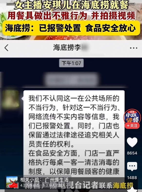 有网友表示,这个女主播不是广州的,而是佛山的,而且这个人可能患有乙肝。还有网友表示,这和人家火锅店什么关系,能碰上这样的人,真的是林子大了什么鸟都有。