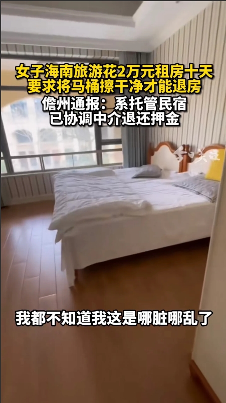 海南儋州,一女子到当地旅游时花2万元租了一栋别墅。可女子退房时却被出租人以打扫卫生不干净为由,拒绝退还押金。女子随即报警求助。网友们看了现场视频和图片后表示,这出租人摆明就不想退。