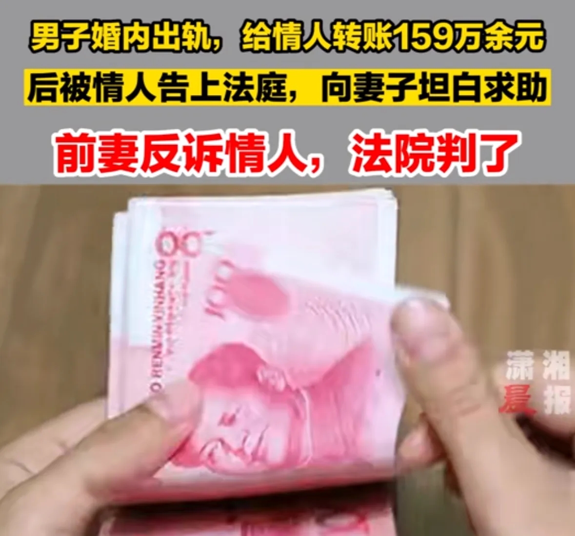 海南一男子,与歌厅女子发生关系后,一直保持情人关系,并给她转款159万。之后,两人感情破裂,男子竟然找前妻,告诉她“这159万是他在和她婚姻存续期间转给情人的”,想让前妻提起诉讼,问情人要回来,前妻就可以拿到一半。前妻将男子的情人诉至法院,法院这样判了!