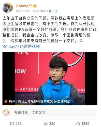 这是反思好了?iboy疑似又要重返赛场了 在昨晚,前EDG AD选手iboy在微博发布一篇长文,疑似准备再次回归赛场,称经过了休赛期的调整和成长,自己会全力改变,以争取一个回归赛场的机会 去年差不多也是这个时候,iboy宣布复出回归赛场,但表现实在是不尽如人意,不知这次复出效果会如何呢?是否已经“反思”好了呢[偷笑][偷笑][偷笑] 当年敢在Faker面前亮牌嘲讽的人,谁曾想后来会变得那么菜。。。 #英雄联盟[超话]#