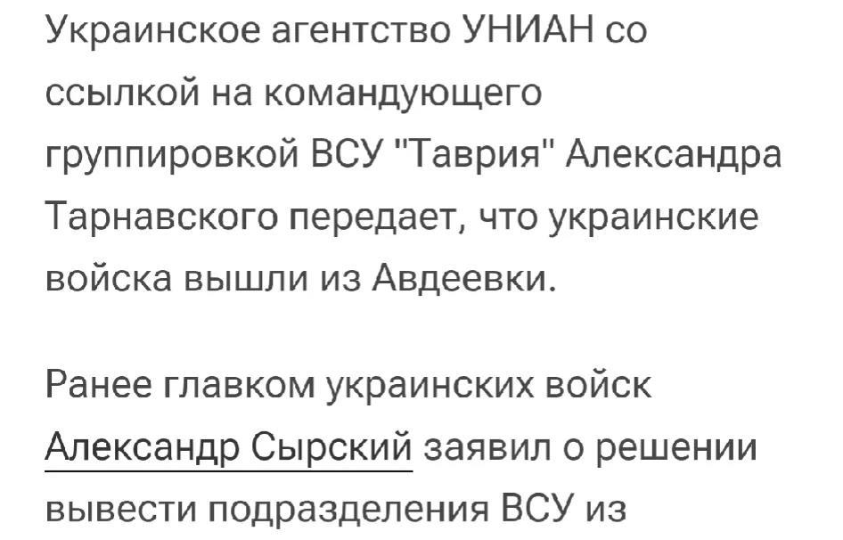 乌军兵败如山倒,跑的比命令还快! 就在刚才,乌军新任总司令西尔斯基宣布“从阿夫杰耶夫卡撤出乌克兰武装部队,转入防御。”#乌军从顿涅茨克地区重镇撤军# 然而尴尬的事发生了,来自乌克兰通讯社的最新报道,就在西尔斯基刚下命令之后,乌军“塔夫里亚”集团指挥官亚历山大·塔尔纳夫斯基马上补充说,“乌克兰军队已经全部撤出了阿夫杰耶夫卡。”#俄乌冲突# 到底是谁下的撤兵命令?!