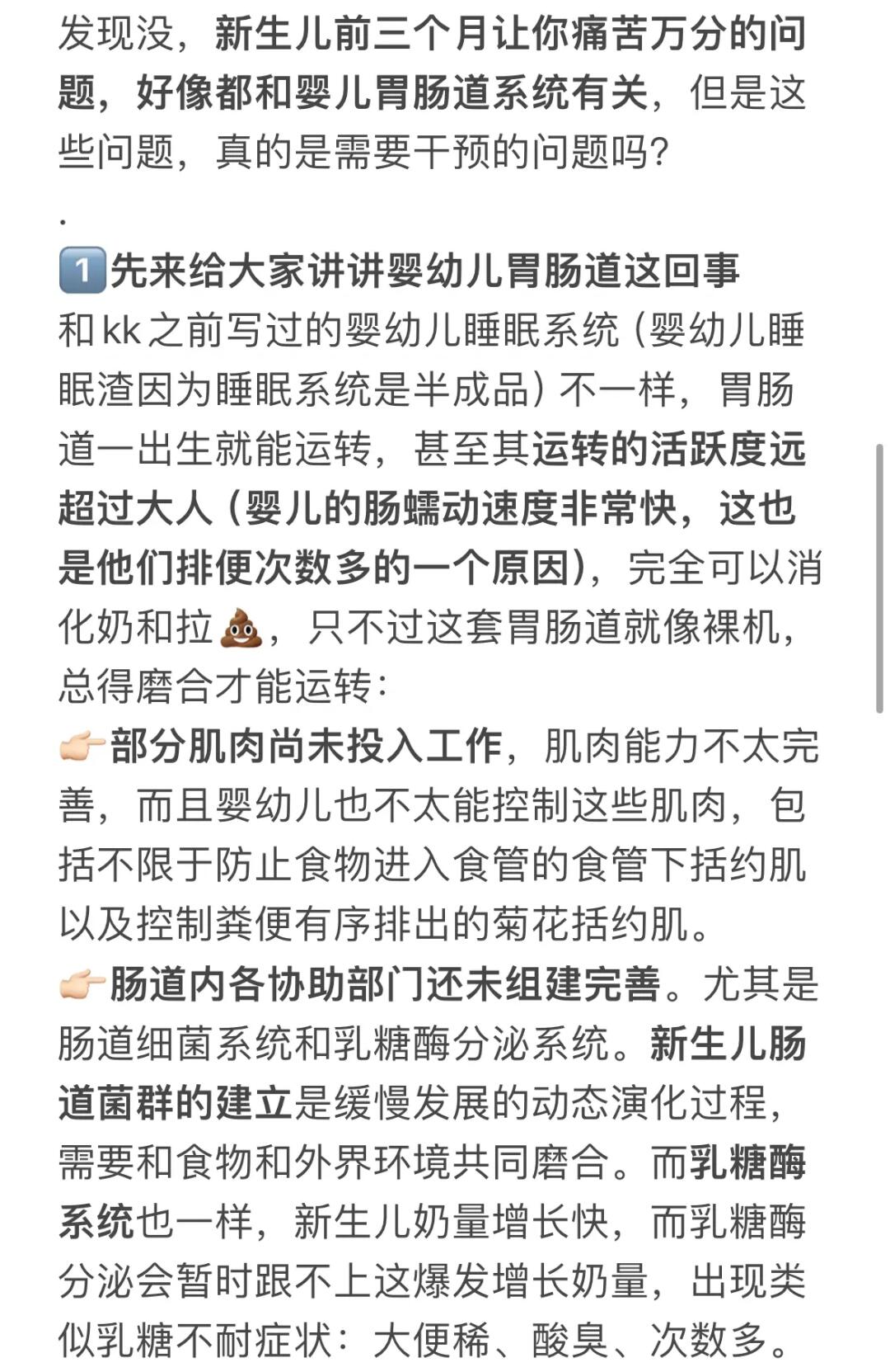 其实这一切的本质是因为:肠道刚出生就真是裸机,不仅各种肌肉控制能力有限同时菌群还没有建立乳糖酶也分泌的不太足,需要通过时间去和食物磨合去和环境接触,才能真正发育成熟,我们解决那些看起来痛苦的问题往往只需要时间和一点点喂养技巧。