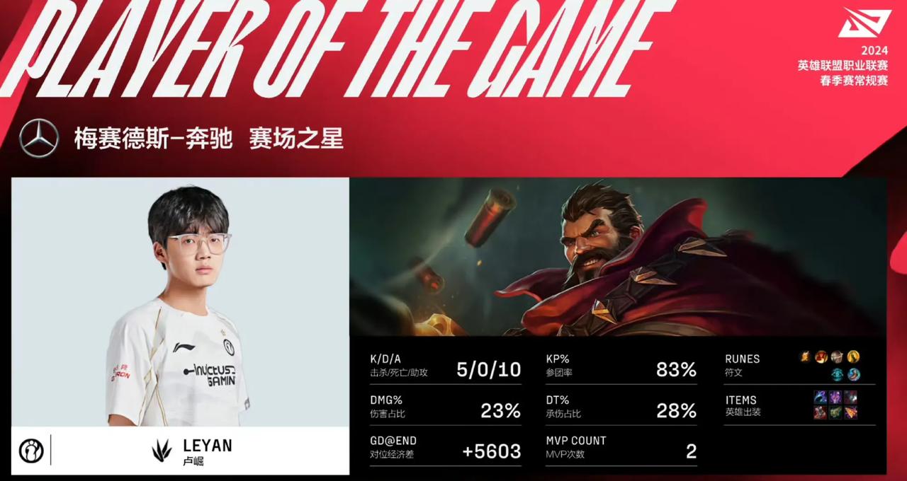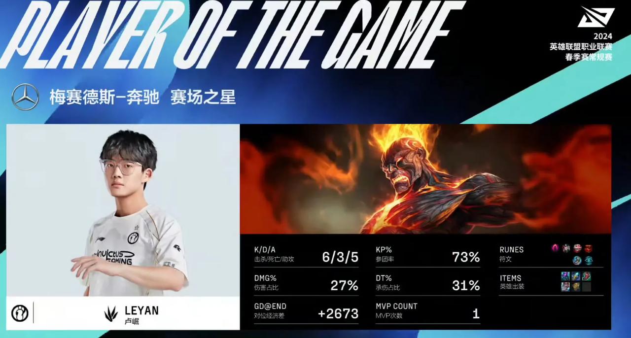 Leyan表示: XUN,我会把你打回现实的,让你知道一下什么才是野核[偷笑][偷笑][偷笑] 在刚刚结束的LPL春季赛上,IG 2-0 爆冷击败了BLG,成功打破了BLG的不败金身,没想到今年LPL春季赛开赛以来最大的爆冷竟然由这支年轻的小IG给完成了 简单总结原因,那就是打野的差距!XUN这场比赛的表现几乎被Leyan给完爆了,从头到尾均被压制,最为夸张的是决胜局竟然被Leyan压了三个等级,典型的打野GAP 这支小IG,有点给人一种梦回S8的感觉了,敢打敢拼,跟对手针锋相对,全程打架,太过瘾了 本以为IG回购Leyan的决策是为了摆烂,是彻头彻尾的昏招,没想到竟然能“弑神”成功 不坠青云,不斩无名!这就是IG的精神[赞][赞][赞] #英雄联盟[超话]#
