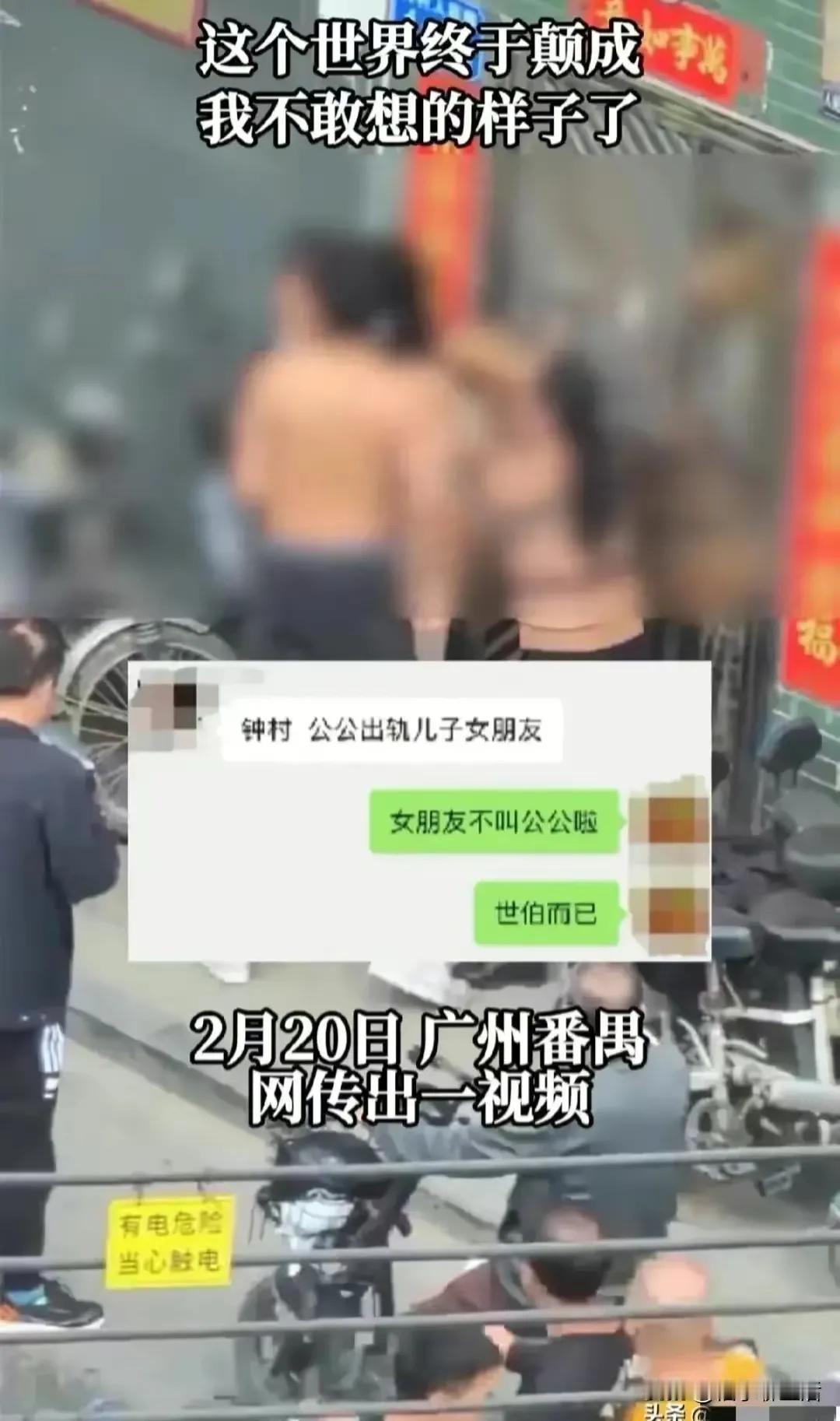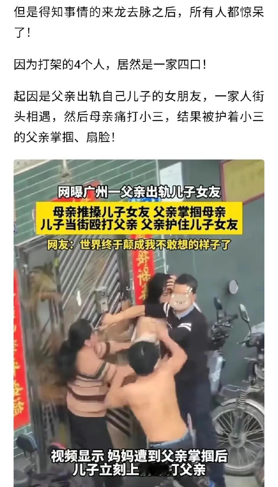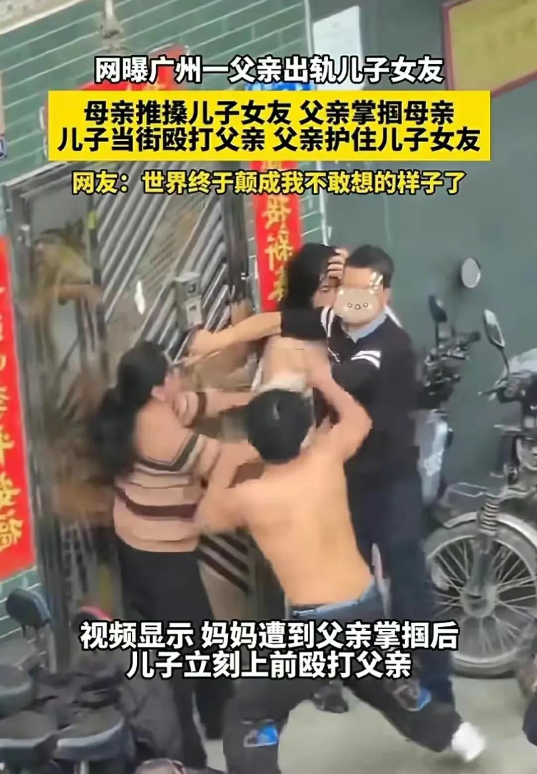 “儿子当街殴打老父亲,只因父亲睡了自己女友”,派出所还介入了! 事情发生在广东广州番禺某地方 儿子谈了一个女朋友,两人相处了好几年,已经到了谈婚论嫁的地步,儿子高高兴兴带着女友回家见父母,没想到公公对这个儿媳很是“中意”。 趁着没人的时候,两人偷偷加了联系方式,而且还在宾馆谈人生,纸肯定是包不住火的! 事情很快就败露了,儿子的母亲得知情况后,就动手殴打儿子的女友以及自己丈夫,自己的丈夫也不甘示弱,对她进行拳打脚踢。 儿子见自己的母亲被打,直接脱掉自己的上衣,光着膀子狂揍自己老父亲,挖墙角竟然挖到自己身上了。 他们一家四口公然在街上打架,最后还惊动了派出所,这分明就是一场闹剧。