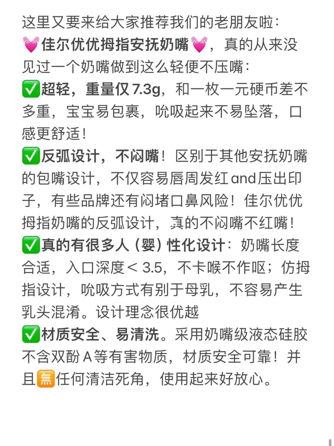 比如,这些很好用的东西,纯水湿巾、背带、安抚奶嘴等,明明是人类之光,却总是被人诟病。比如安抚奶嘴,真的很好用。比如像佳尔优优拇指安抚奶嘴,重量轻好含吸、仿拇指设计能避免乳头混淆、反弧设计不闷嘴不红嘴;材质安全🈚清洗死角,不仅能替代小朋友的非营养吮吸需求,给宝宝安抚。并且也是比妈妈rt和手指更容易戒断的安抚物,合理使用真的能让大人获得片刻喘息。这么好用的东西,网络上却充满了各种危言耸听,让各种新生儿家庭看了望而却步。