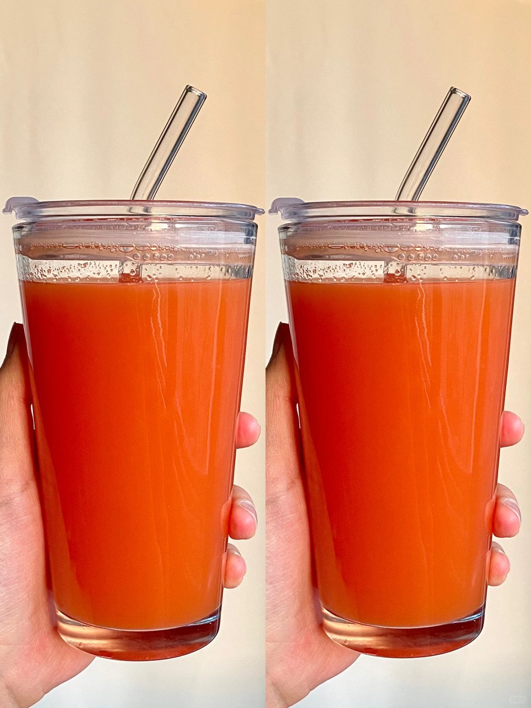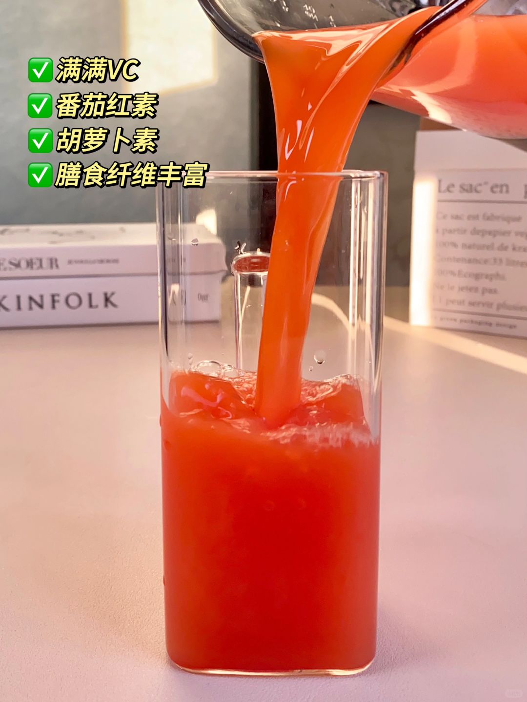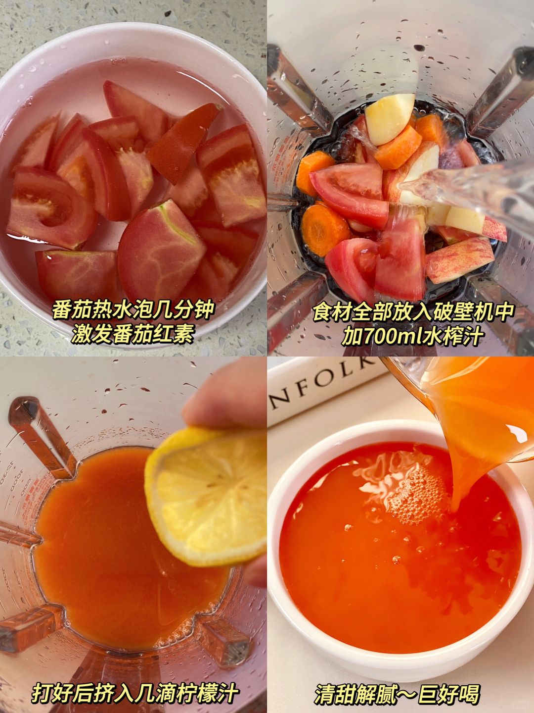 经常熬夜、小脸腊🟡的姐妹一定要喝起来! 平时火锅重口味吃的比较多!还不爱运动!可以适当喝一点温热的果蔬汁哦!!清爽又解腻,营养也补充了~这杯富含VC和番茄红素,对👀和🧏🏻♀️皮肤不要泰友好! 📝食材:苹果半个、番茄、胡萝卜半根、柠檬1片 ✔️做法:番茄热水泡5分钟左右,食材清洗干净放入破壁机,加700毫升水果汁模式打2.5min 做法简单5分钟就搞定啦!是酸甜的口感! 还蛮好喝的!酸酸甜甜的!🧏🏻♀️真的不要太掉色了!