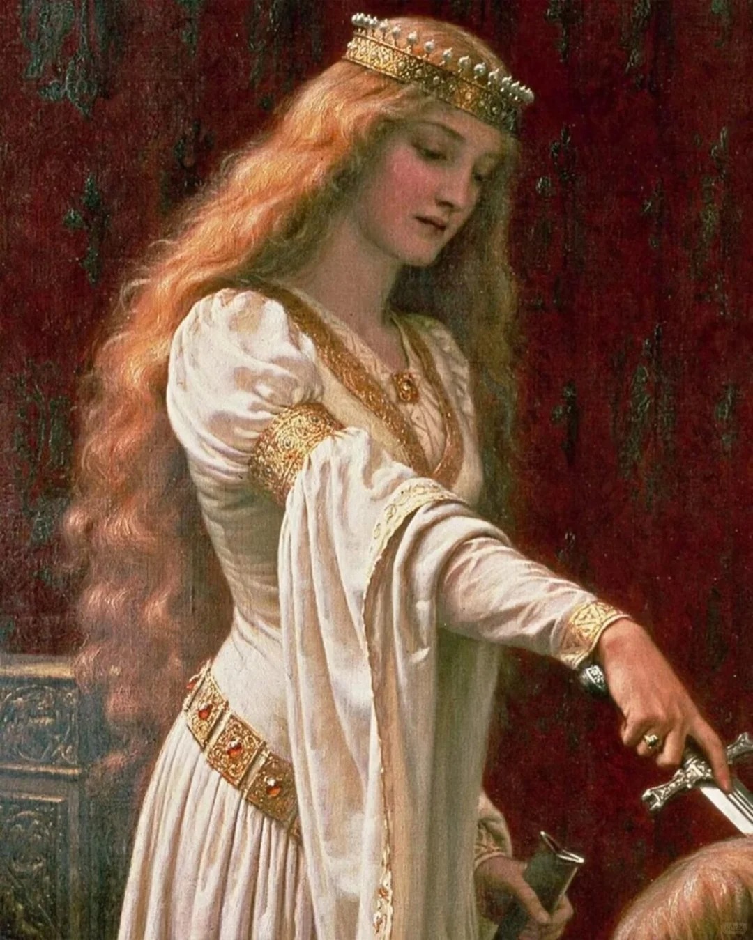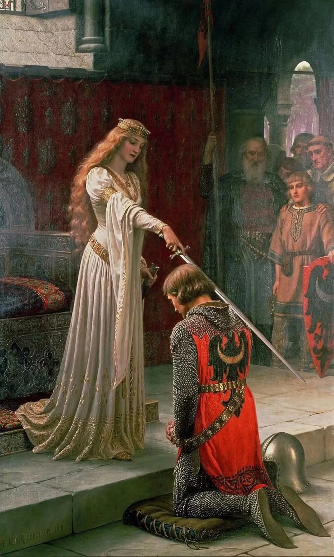 每天认识一幅名画——第155幅 名称:荣誉 英文名称:The Accolade 创作者:埃德蒙·布莱尔·雷顿 国籍:英国 年代:1901年 规格:182.3 x 108 cm 类别:情境 材质:布面油画 位于:私人收藏 . 画面中一位身着铠甲的男人恭敬地跪在地上,头戴王冠的红发女王站在王座前,庄严地将利剑放在他的肩上,并授予其“骑士”的荣誉与权力。女王的左边聚集着一群见证受封仪式的观众,他们全神贯注的表情将气氛烘托得更加肃穆而神圣。 . 在各种经典的骑士拯救公主的爱情故事中,潇洒的骑士总是一身戎装,披荆斩棘之后成为世间传颂的英雄。但在中世纪的欧洲,所谓的“骑士”实际上就是封建领主的“保镖”。11世纪前,只要买得起战马、盔甲,愿意向领主臣服的人均可成为“骑士”。12至13世纪以后,随着罗马教会地位的上升,要求骑士不仅要虔诚地信仰基督教,还要遵循骑士法则。至此,“骑士”的授予仪式变得神圣而复杂,只有参加仪式的人才能真正享有“骑士”的封号。 . 埃德蒙·布莱尔·莱顿(Edmund Blair Leighton,1852-1922)是英国画家,擅长绘制中世纪题材的历史画作,在画中他还原了无数与公主、骑士有关的经典传说故事。1878年,他担任英国皇家艺术学院的院长,并展出了自己的作品。 . 每天分享名画 . 每天进步一点点 . 关注我,每天认识更多画作