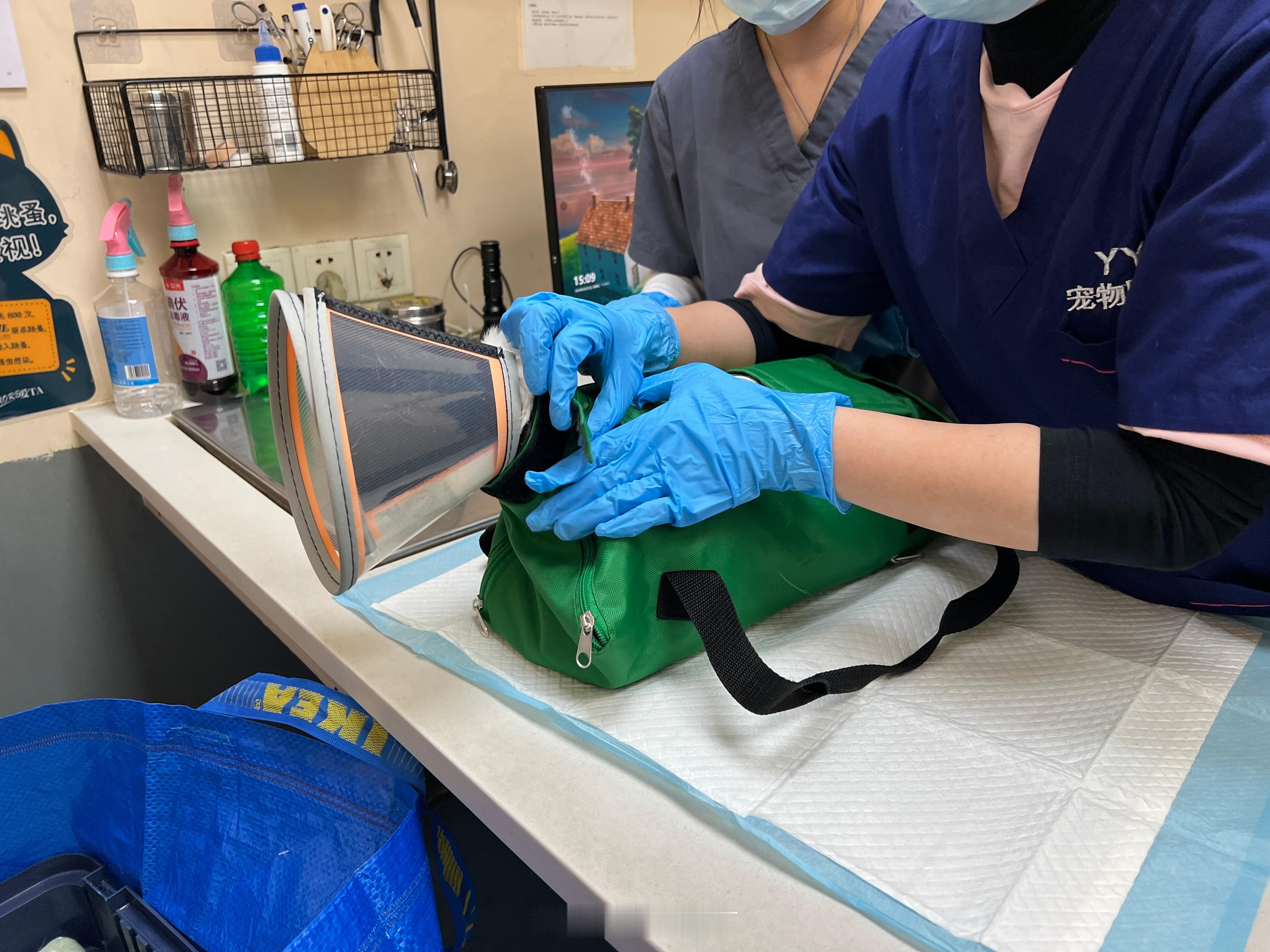 到了診療室,醫生和助理姐姐快速的給吉吉套上了保定袋,原以為這個過程就足以讓吉吉咆嘯、炸毛、 掙扎,沒想到都順利完成了,一邊覺得不可思議、一邊也擔心受傷的腳趾如何治療,因為擔心吉吉用力掙扎時會傷到人,在出門前先剪好指甲,到了醫院後,醫生又重新一隻隻的幫忙修剪,包括周圍剝落老化的指甲片,也一隻隻的清除掉,才不會磨擦刺激到周圍皮膚,這個過程加上了保定,吉吉都在很穩定的狀態下完成,直到要處理翻起來的指甲,先做了清理毛和血漬的部份,這裡已經讓吉吉牙起來了~~~然後咆嘯!直到醫生說整隻斷了,軟腿只差沒跌坐地上,好在過程也是比想像中的快、且順利結束,醫生交代回家若會舔傷口就要戴頭套,碘伏擦個幾天,保持乾燥,之後就不用過度清潔,讓指甲慢慢長回來就好⋯⋯😭😭😢