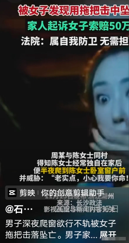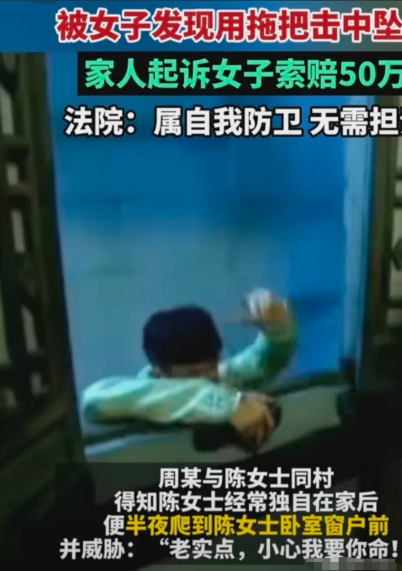 浙江湖州,邻居男子看女子丈夫不在家,就萌生不轨之心,深夜爬窗入室。不料女子惊醒,用拖把击中他,男子从二楼坠亡。家属索赔50万。被拒后把女子告上法庭,法院这样判了!