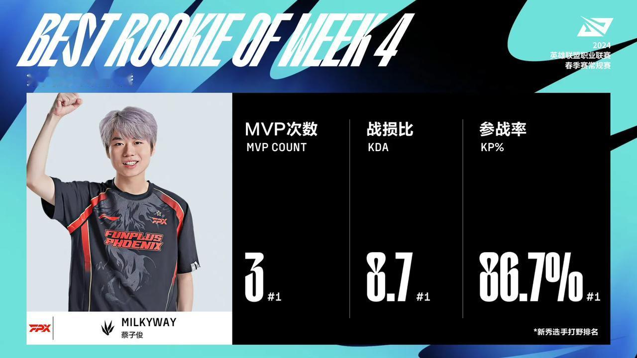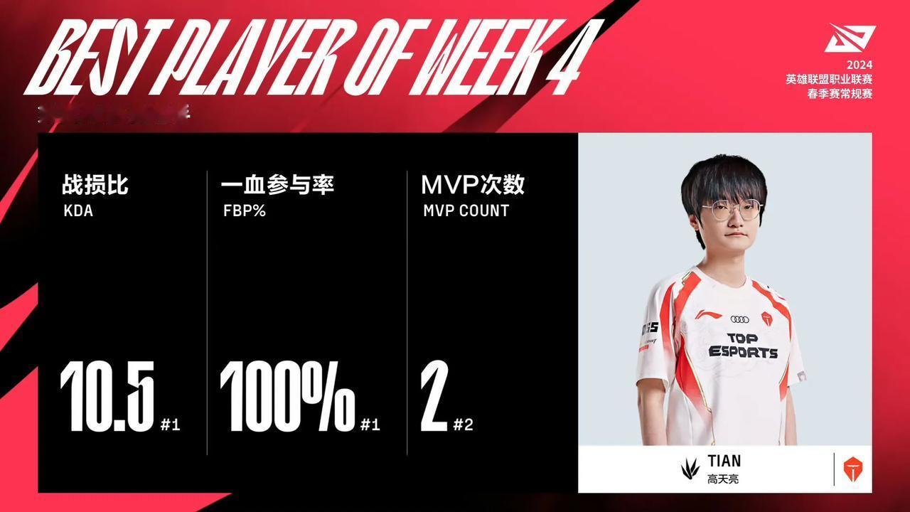 LPL春季赛常规赛第四周最佳阵容: Tian斩获MVP,FPX打野Milkyway连续四周当选最佳新秀 LPL春季赛常规赛第四周的最佳阵容公布,具体如下: 上单369、打野Tian、中单Rookie、AD 阿水哥哥、辅助IWANDY 最佳新秀 FPX打野Milkyway 周MVP Tian 只能说TES不愧是联盟顶级流量队!最佳阵容竟然有三支TES队员,而表现最好的BLG则无人上榜。。。 #英雄联盟[超话]#