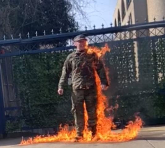 【突发!#一美军军官在以色列大使馆前自焚#】据美国《纽约时报》报道,当地时间周日下午,一名身着迷彩服,自称是美国空军现役军官的男子,竟然在位于美国首都华盛顿的以色列驻美国大使馆门前,点燃了自己。