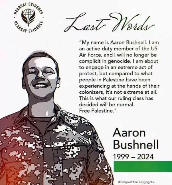 无法面对以色列对巴勒斯担种族灭绝的美空军现役军人!布什奈尔!希望用自燃去换醒美国人的良知!真正的烈火天使![作揖][作揖][作揖]