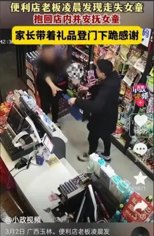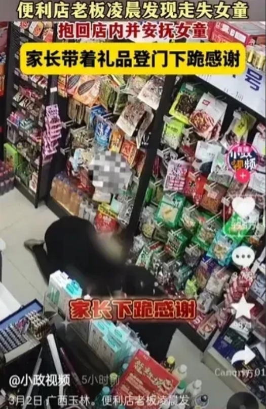 广西玉林,一女童凌晨独自一人在街上,便利店老板发现后,将其抱回店里。女童说要找妈妈。便利店老板抱着女童,帮其找到了妈妈。第二天,女童的家长带着礼物,来到便利店表示感谢。女童家长甚至下跪,便利店老板慌忙回跪。真的是太暖心了。
