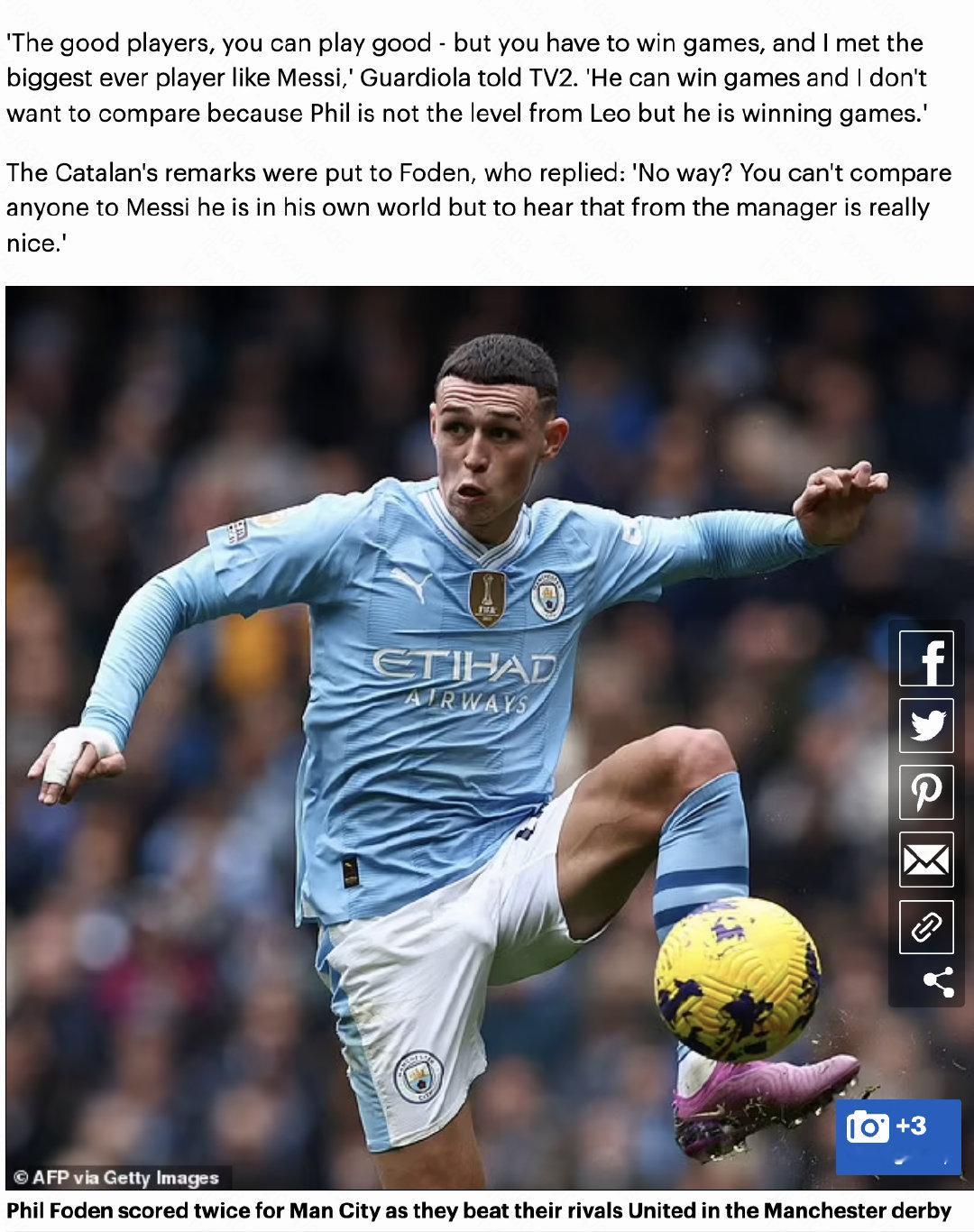 福登表示🎙️:“不可能吧,你无法将任何人与梅西进行比较,他在自己的世界里。但听到教练这么说真是太好了。”