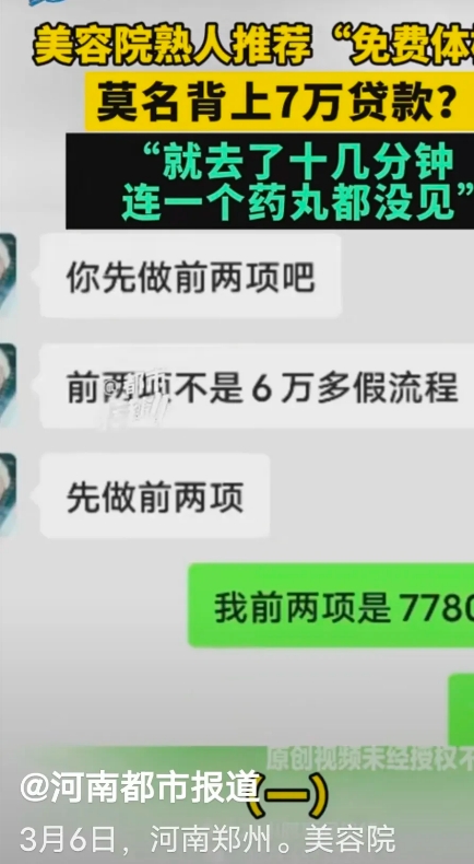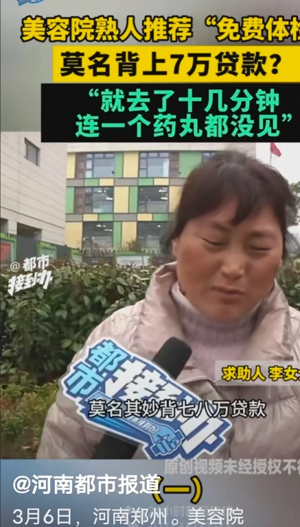 河南郑州,女子和朋友被熟人拉去做美容治疗,前台拿着手机为他她们办理手续。她们在床上躺了十几分钟,到家后却发现, 她手机上莫名背了7万贷款,朋友手机上背了4万,两个人一共背了11万贷款。于是她哭着求助记者。李女士嚎啕大哭:“这可怎能活啊?”