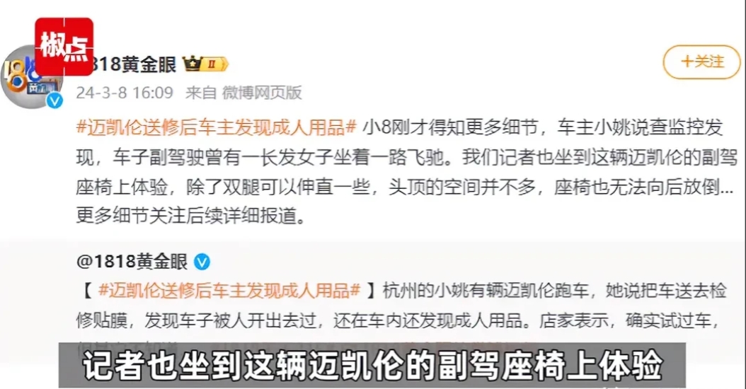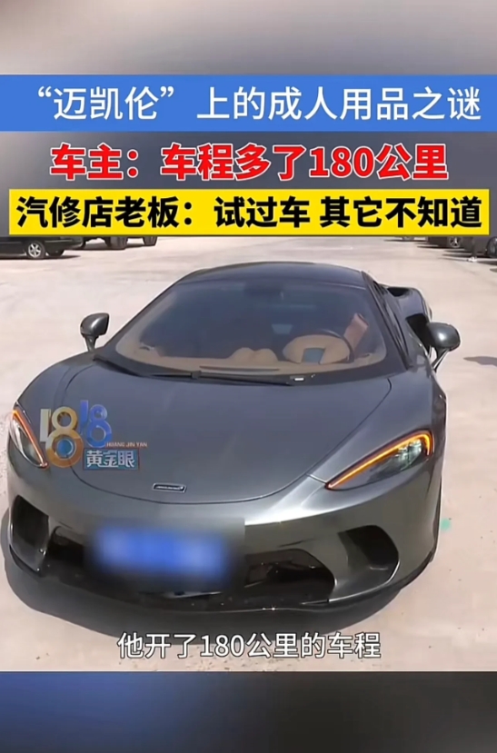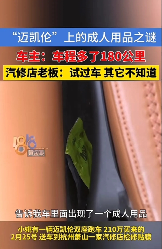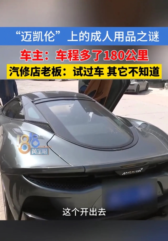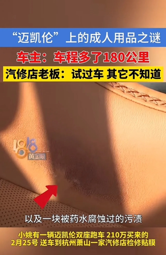 浙江杭州,一女子将一辆价值210万元的迈凯伦双座跑车开到汽修店贴膜后,居然发现车上有两个计生用品、车座上还有一块被药水腐蚀过的污渍且车子还被开了180公里。汽修店老板声称,是试过车,但其他的其表示对此不知情!(来源:1818黄金眼)