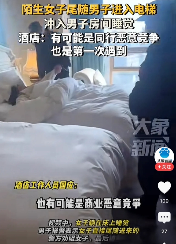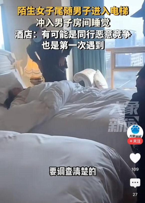 浙江嘉兴,一男子入住酒店开门后,突然一名陌生女子闯了进来,直接反锁房门上床倒头就睡,男子大吃一惊赶紧选择了报警,民警来到现场后,将女子带回调查。让人颇感意外的是,酒店对此回复称有可能是同行竞争,开店这么久第一次碰到。