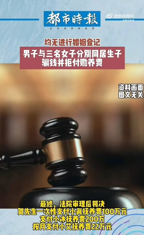据此,法院判定贺某分别支付冰某、真某抚养费200万元、100万元;并按月支付艾某抚养费22万元。
