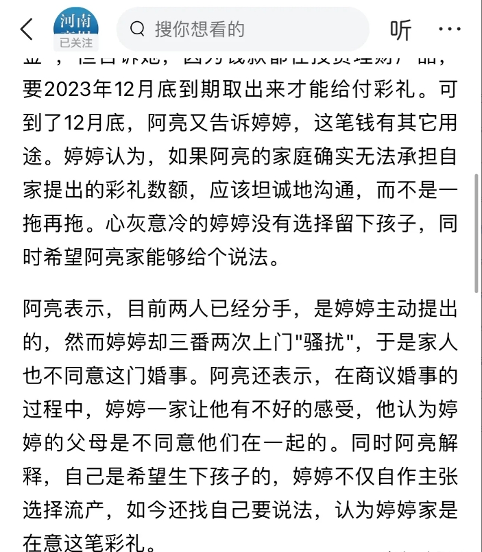 当时,阿亮一口答应了22.3万的彩礼,但是却表示这笔钱现在在理财,取不出来,到了时间之后,阿亮又表示这笔钱已经挪作他用了,没办法拿出来支付彩礼。