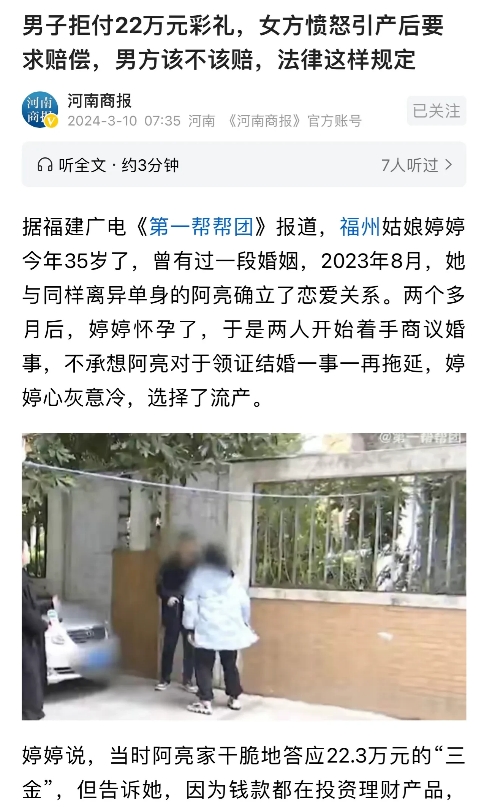 福建福州,一对情侣恋爱后,女方怀了孕,于是两个人着手商量结婚的事情,男方也是一口答应了22.3万的彩礼要求,谁知,因为彩礼迟迟没收到,女方直接选择了打胎分手,分手后,女方要求男方对自己身体遭受的伤害进行赔偿。