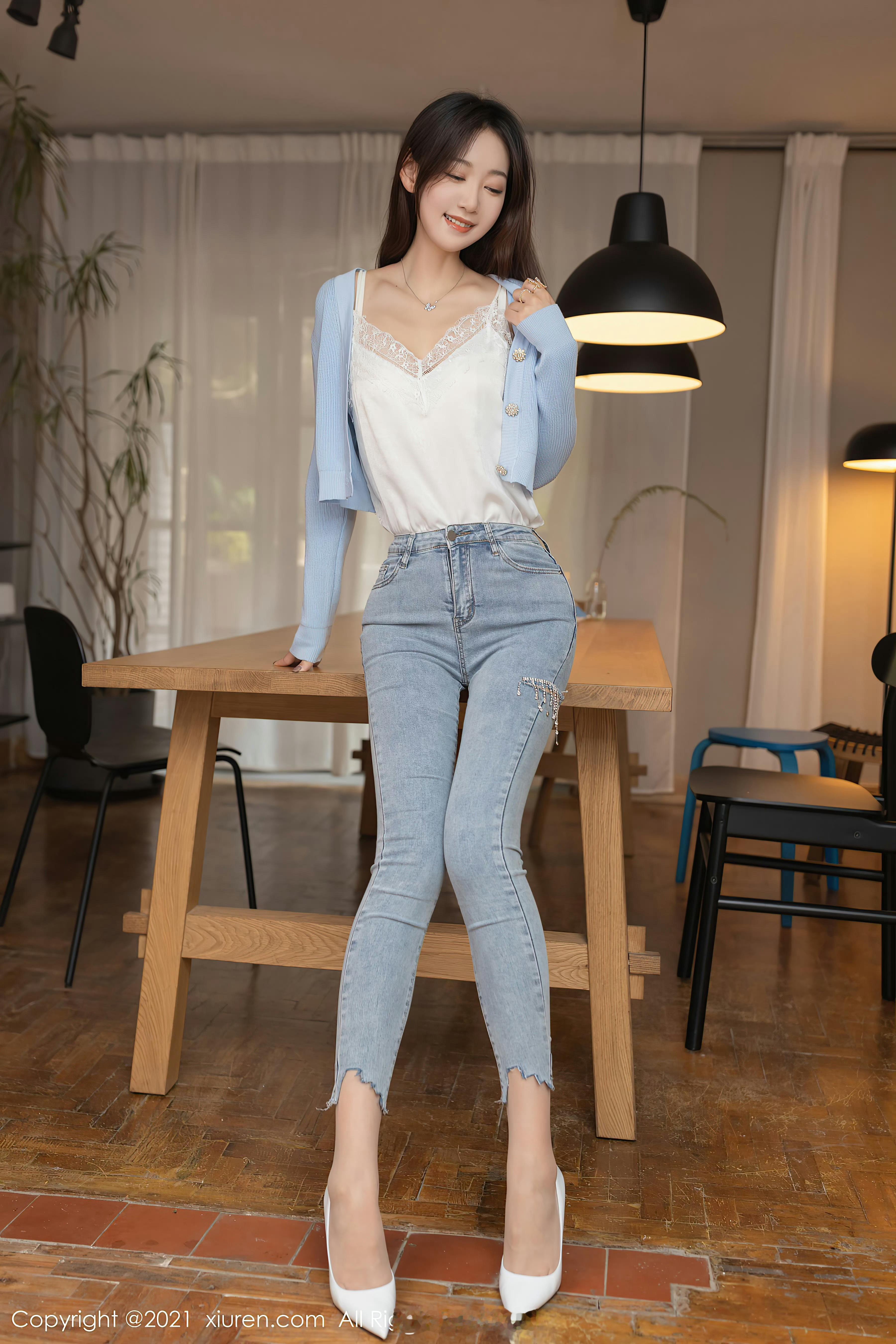 紫色上衣搭配蓝色牛仔裤简约又好看