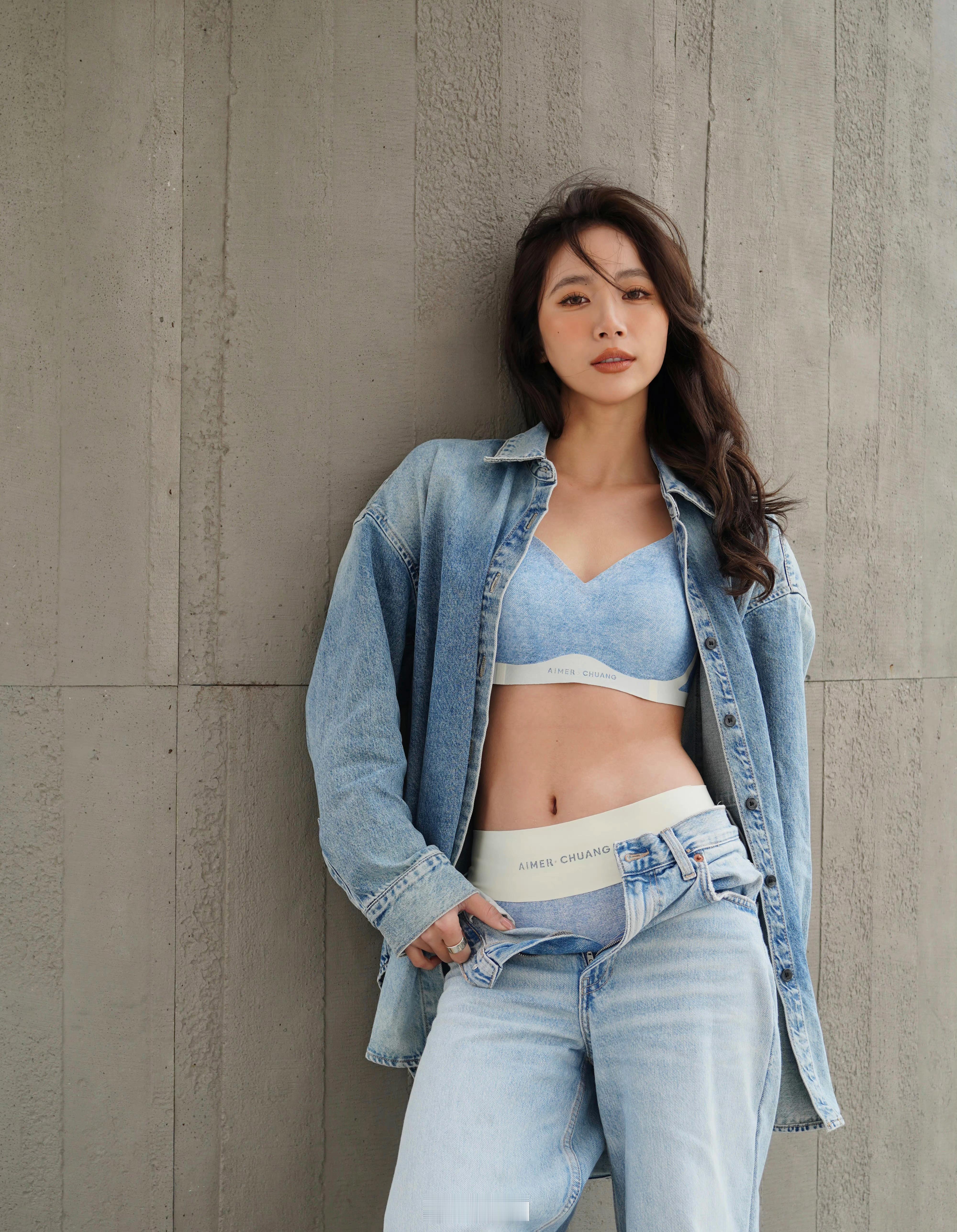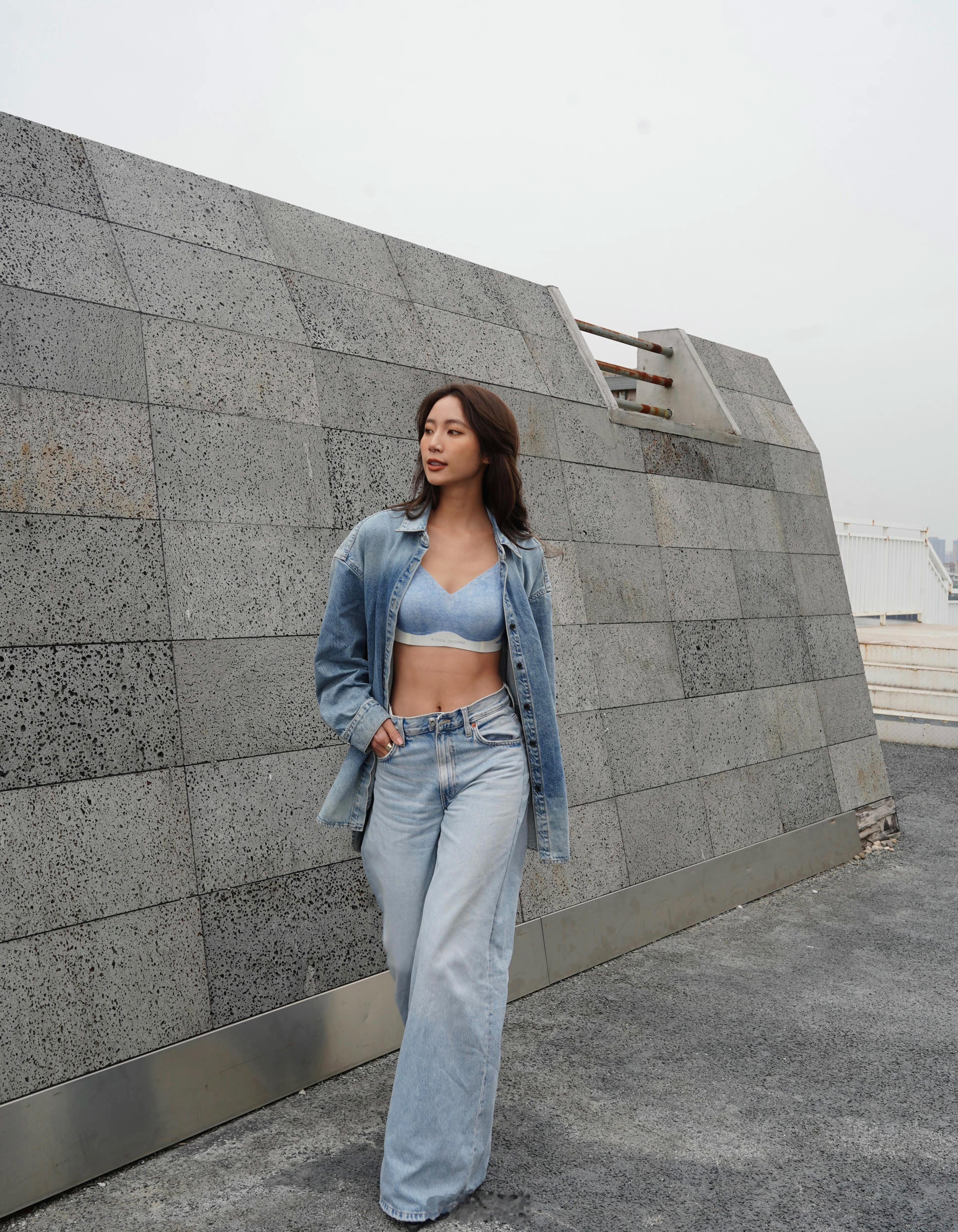 紫色上衣搭配蓝色牛仔裤简约又好看