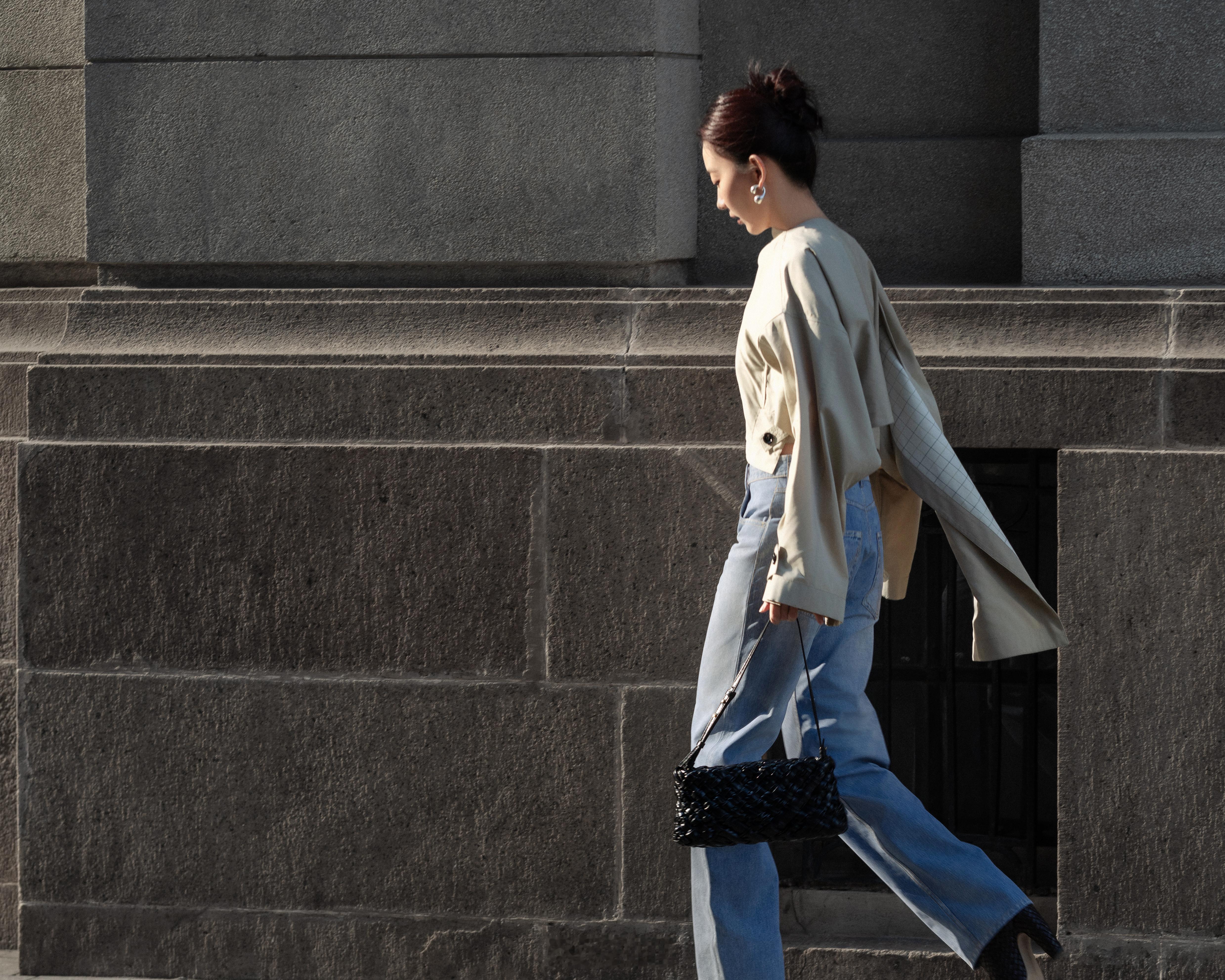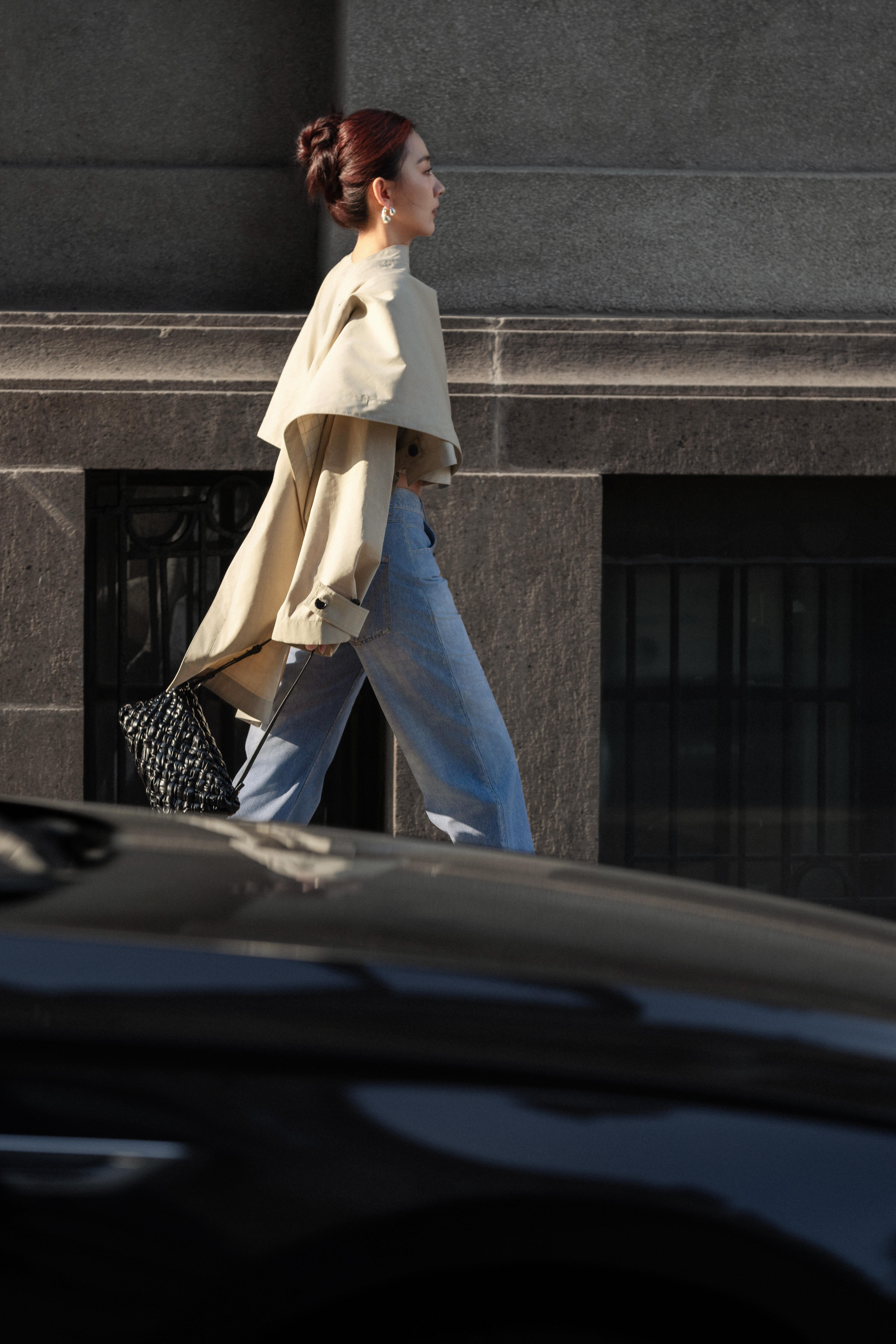 紫色上衣搭配蓝色牛仔裤简约又好看