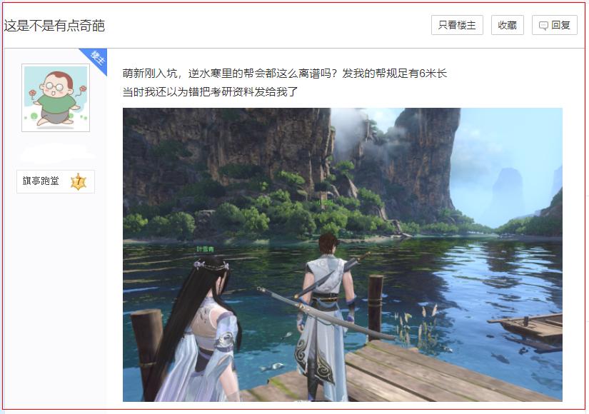 帮规长达6米之多的网游帮会,你们见过吗? 最近,有一位网易MMO网游《逆水寒》的玩家就十分闹心,在游戏中加入了一个新帮会,结果这个帮会太奇葩了,光帮规就长达6米之多! 在这6米长的帮规上面,写满了密密麻麻近千条的注意事项,并且帮主还要求每个帮众全都记住!这都快赶上考研的难度了好吗? 而且里面的内容也是包罗万象,比如对于管理权威的尊重,帮战时的注意事项,甚至从筹备期到战斗尾声都有详细并且极度严格的流程! 这位萌新不解,难道《逆水寒》帮派都这么多要求吗? 其实不然,这个帮派是《逆水寒》当中的老牌联盟,特别是2.0更新之后大肆吸纳萌新,俨然已经成为所在服务器里数一数二的顶级帮会,这种规模的帮会,树立一些条条框框很正常,不过长达6米的帮规,说来还是有些离谱了。 你们觉得呢?