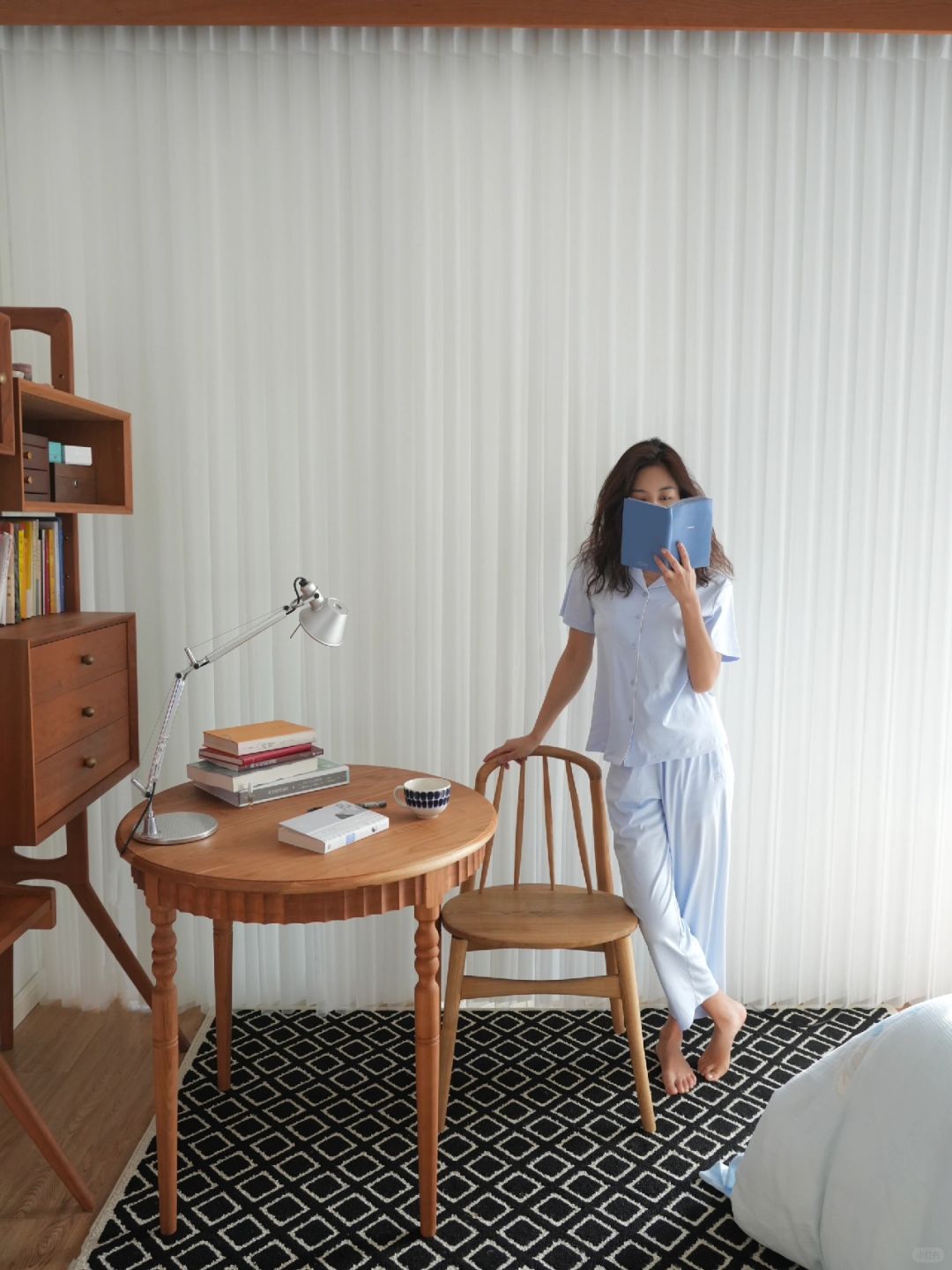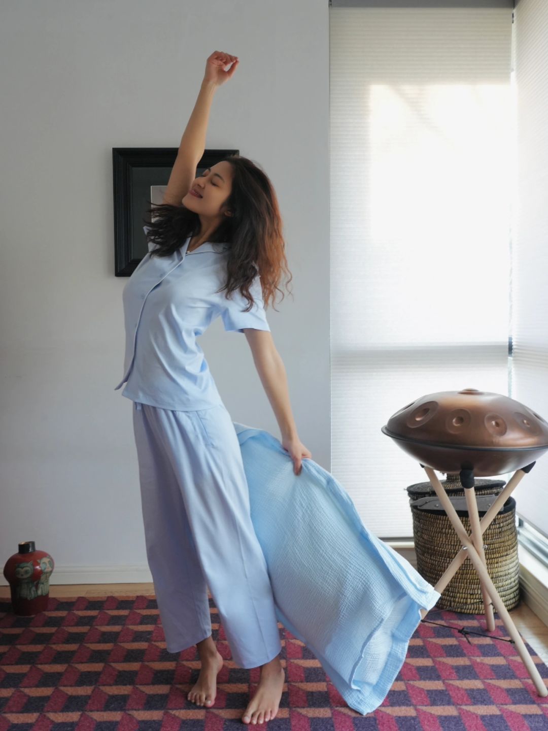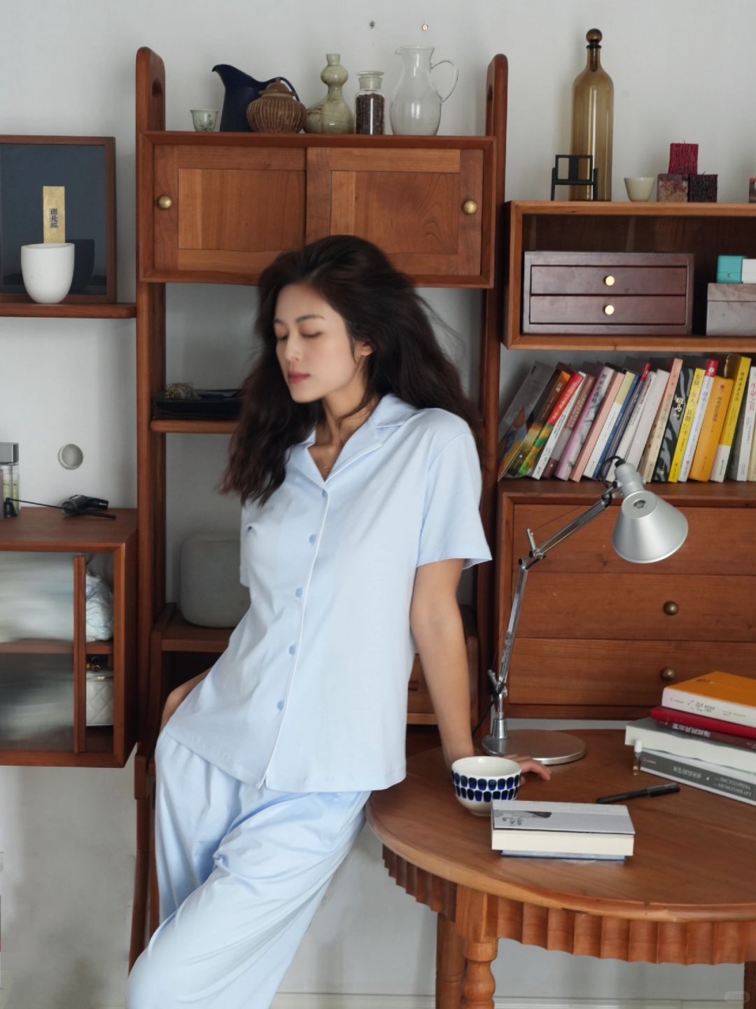 之前换季买过别的丝光睡衣都没有这套给我的天然凉感强,即使水洗多次后,凉感也依旧明显。亲肤细腻,宽松版型,给身体足够放肆空间,九分裤的设计在家里坐、站、躺、翻都非常利落,做做简单的拉伸瑜伽也很舒适~