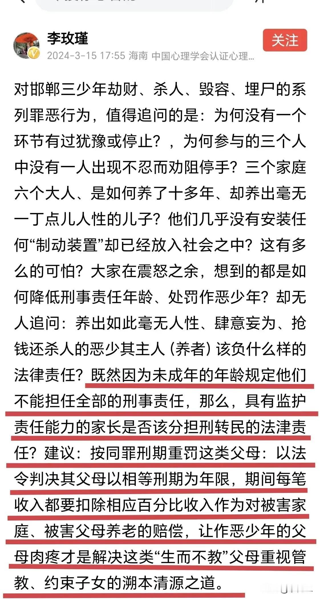 刚刚刷到,邯郸三个恶少杀了一个学生。看了报道,令人发指,勒索,杀人,辱尸,埋尸,然后还若无其事的上学,这是什么家庭能养出如此恶魔。他们的学校平时有无普法教育。这种行为是青少年应该做出来的吗? 这三个人是什么样的家庭,能培养出这种恶少。简直是禽兽不如。 应当细访他们的监护人,孩子是这种畜牲,其父母十有八九就是从小纵容,或父母本身就是恶人。或就有前科! 回想三十年前,老索少年时,也经常被一群孩子欺负。当时学校还不管这事!父母为生计只要不出大问题,基本就当作孩子打架,闹着玩。其实,根本不是闹着玩,当年他们每个人,手里都有杀人的东西。我知道的,是一根罗纹钢,前面是匕首刀形,有五十公分左右,他们常以欺负同学赚烟钱,因为是未成年,学校拿他们毫无办法。 初中勉强毕业,考不上高中就去混社会了。前几年我回老家,遇到几个同学,问及这些人的情况。基本都是看守所常客,有人三进宫,四进宫。其实当年他们的父母就是社会氓流。些人根本不是什么未成年,他们什么都懂,根本不是误伤。他们单纯的就是坏。如果青少年失手误伤,当然可以原谅,但这种明明就是恶意杀人,如果放过,就是对社会不负责,他们要是走向社会,就是给社会放了定时炸弹。 李玫瑾老师说,以刑期为底限,按收入比例给被害人家送钱养老!对于这种恶意杀人的青少年,彻底免于刑责,可乎?不可乎???