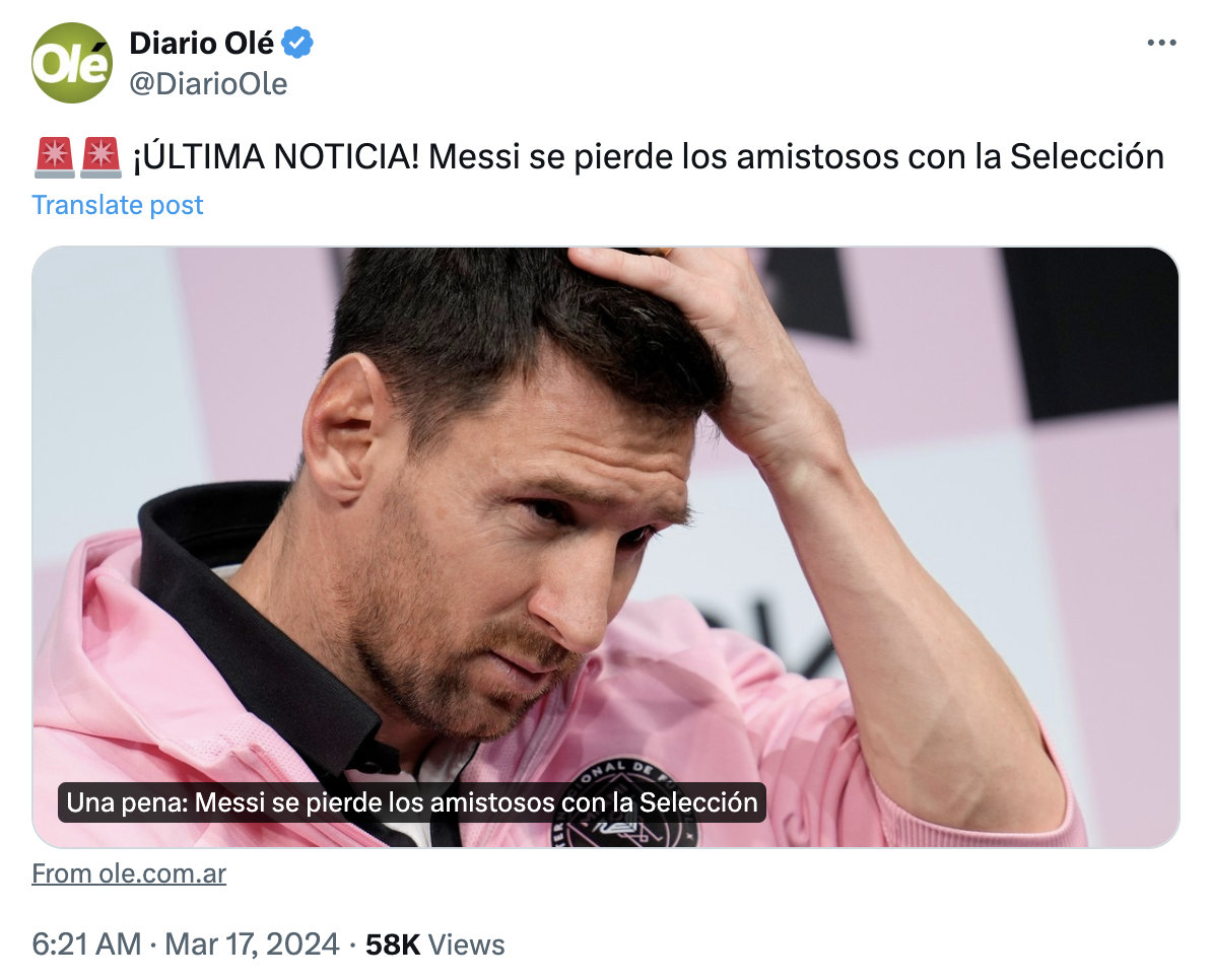 TYC体育:梅西不会参加阿根廷3月友谊赛。