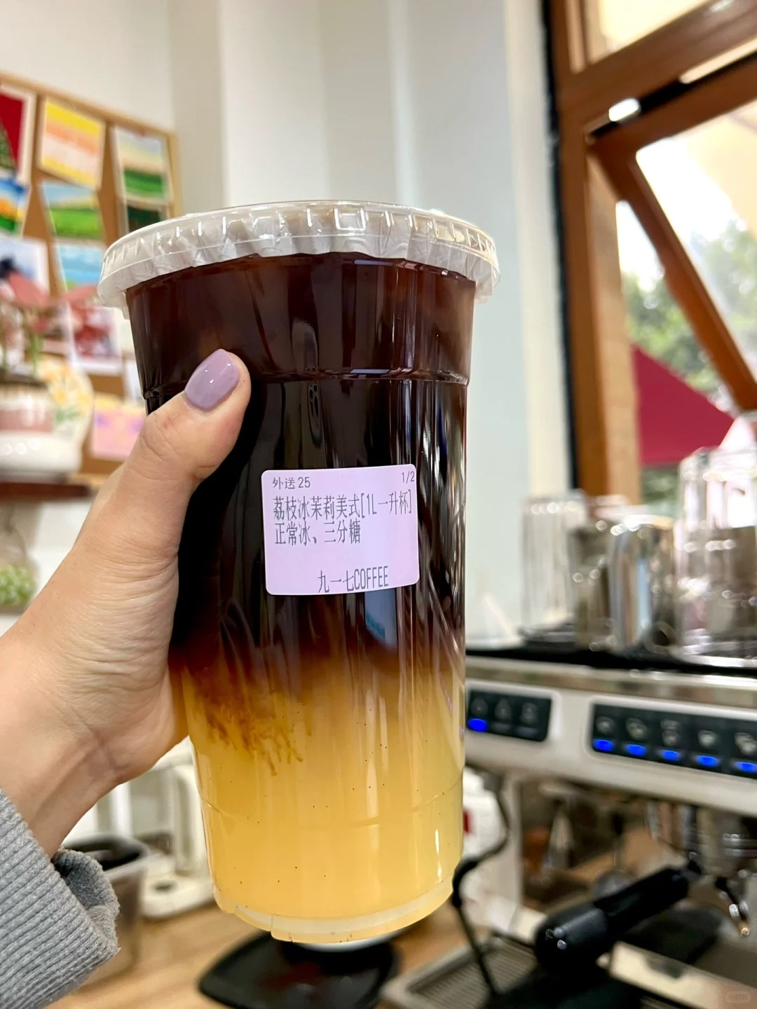 1L荔枝冰茉莉美式!!!! 昨天真是激情四射的一天 从早到晚没歇过气 谢谢大家给我这破天荒的富贵 非常充实非常忙碌(在吧台的我就像工作版的小英) 昨天下午有两个工商的妹妹过来写论文 我就一直在打咖啡收快递(新的纸袋到了) 忙完了已经是傍晚了,这个时候看到她们还在写论文(偶尔我们会聊天)突然有一阵恍惚我感觉我们就像大学同学在教室上晚自习的错觉