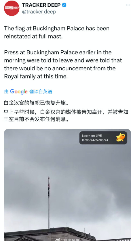 速报:白金汉宫降半旗,所有人都在等着英国王室宣布凯特王妃去世的消息。然后白金汉宫降下的半旗又升上去了。 白金汉宫的旗手是今天最忙碌的人,降旗—>升旗—>降旗—>升旗.....