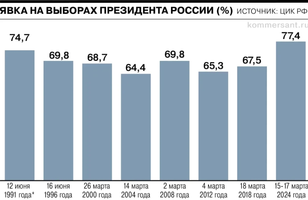 潘菲洛娃说,历史性的投票是通过三天的投票和“移动选民”系统来确保的。她认为,投票率高的主要因素之一是西方对俄罗斯外交政策的压力。俄罗斯人民不能容忍国内外的压力。根据她给出的数据,共有87113127名选民参加了投票(1月初俄罗斯人口为146203600人)。根据俄外交部的数据,37.2万俄罗斯公民在国外投票。普京在这次选举中获得了创纪录的选民投票,共获得7590万张选票。