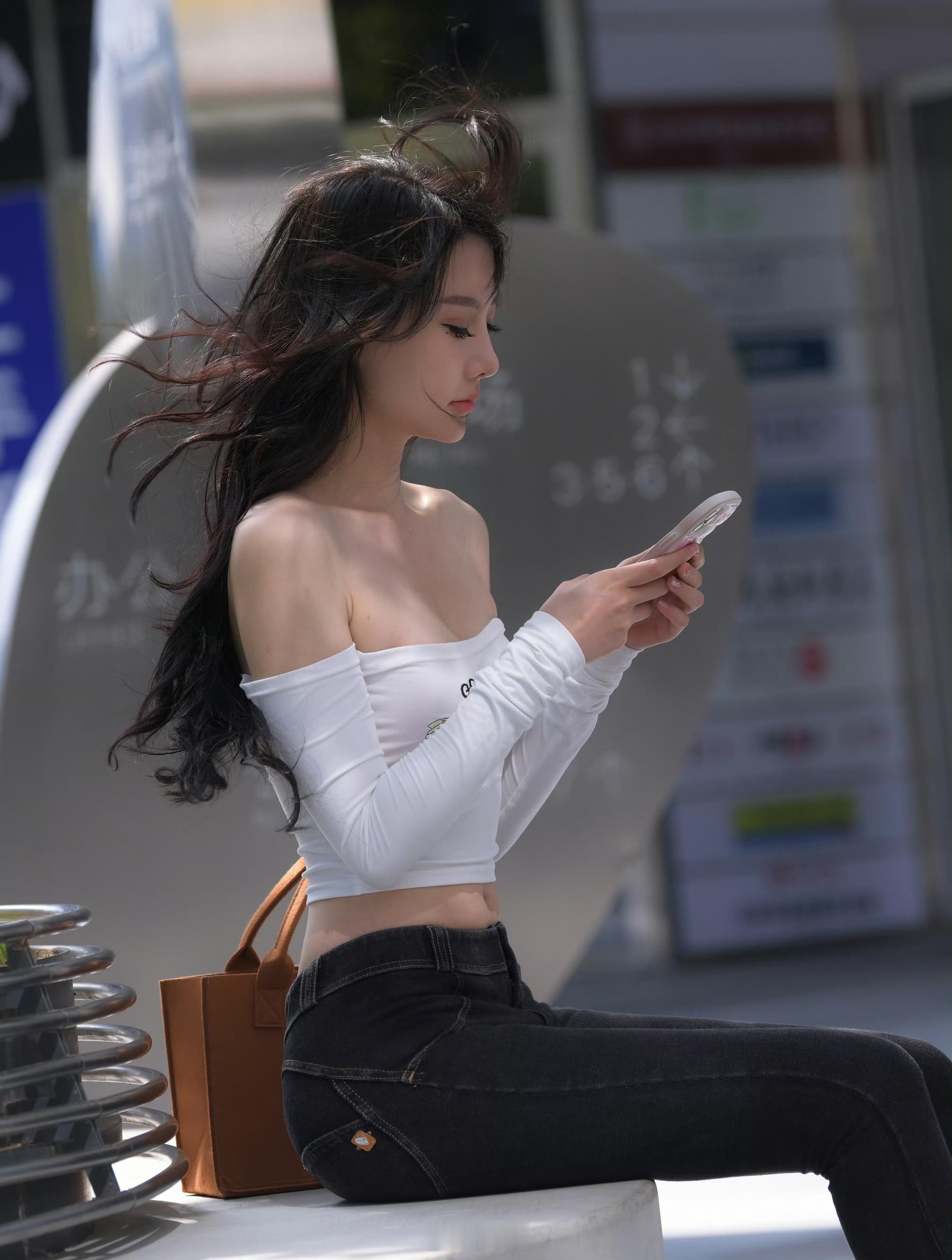白色的上衣和挎包的颜色好搭