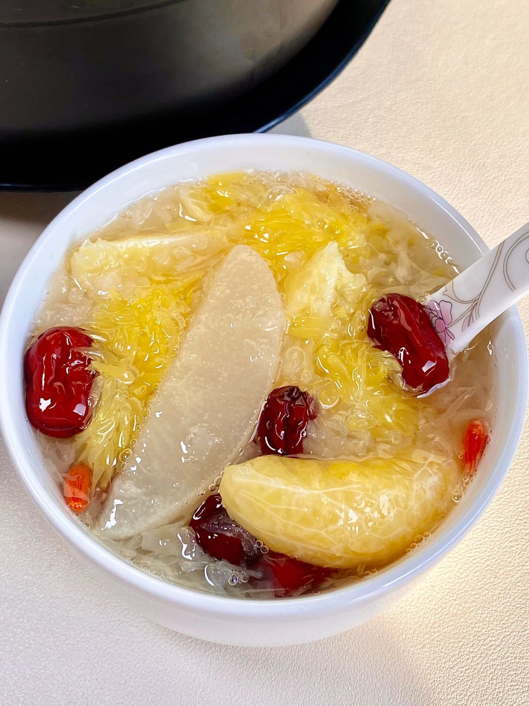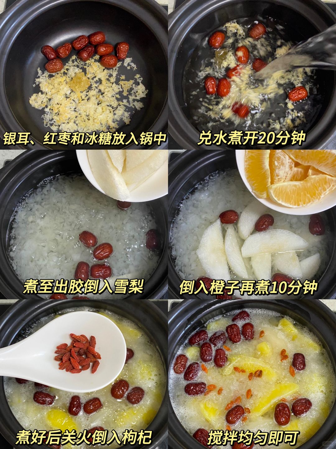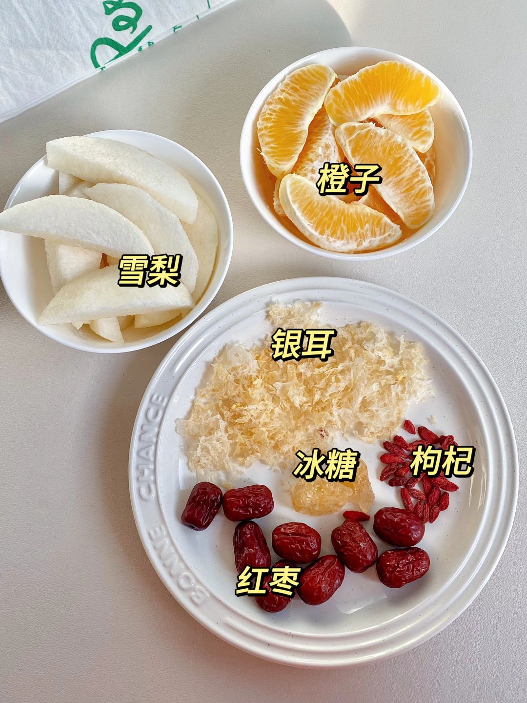 橙子雪梨银耳羹!!秋冬天喝真的水润爆了💦 尤其是熬夜上🔥、秋冬沙漠皮、小脸腊🟡的姐妹!答应我,一定要试试这碗!!水水润润!香甜好喝!! 雪梨脆甜,搭配嫩滑胶质满满的银耳,咬一口就爆汁的橙子!真的巨巨巨好吃😋 📝雪梨、橙子、银耳、红枣、枸杞、冰糖 ✔️做法:红枣、银耳和冰糖放入锅中,兑水煮至出胶,倒入切好的雪梨和橙子再煮10分钟!煮好后关火加入枸杞,搅拌均匀即可 真心建议女孩子该人手一碗…坚持喝 从喉咙到🧏🏻♀️小脸,整个人都💦水润润哒~
