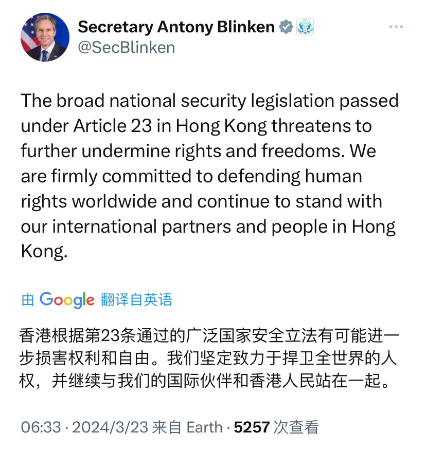 美国国务卿布林肯刚刚(北京时间3月23日6:33)发文叫嚣:“香港根据第23条通过的广泛国家安全立法有可能进一步损害权利和自由。我们坚定致力于捍卫全世界的人权,并继续与我们的国际伙伴和香港人民站在一起。”