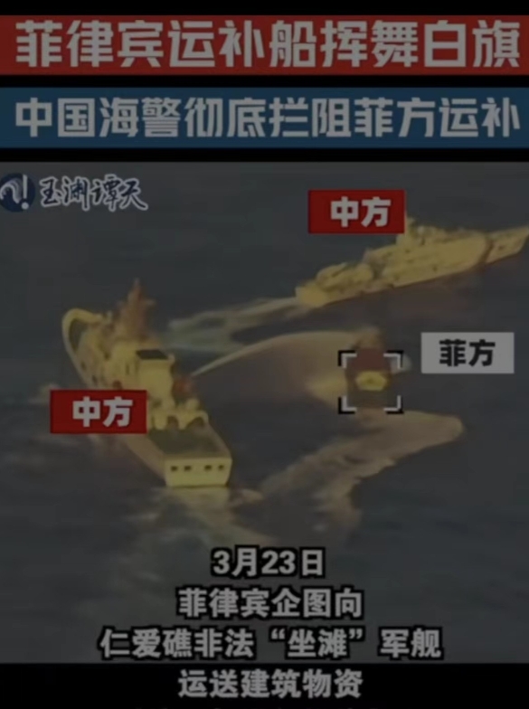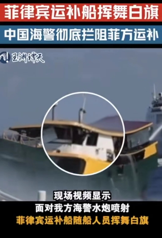 这一次真的很痛快,我海警用水炮拦阻了菲律宾的运补船。今天这次的拦阻跟以往有些不同,我们的水炮加大了功率,菲律宾的运补船吨位很小,直接被水炮打得偏离了方向,而船舱里的随船人员早就被吓破了胆子,急忙举起白旗投降。这下好了,建材废了,那个运补船估计也要报废了。大家看了这顿视频都很开心,觉得大快人心。长期以来,我们一直说处置,管制。很多网友不理解,今天给大家看的这些视频,就是告诉大家什么叫管制。这个就叫管制,很厉害吧。中国海警,好样的,威武!