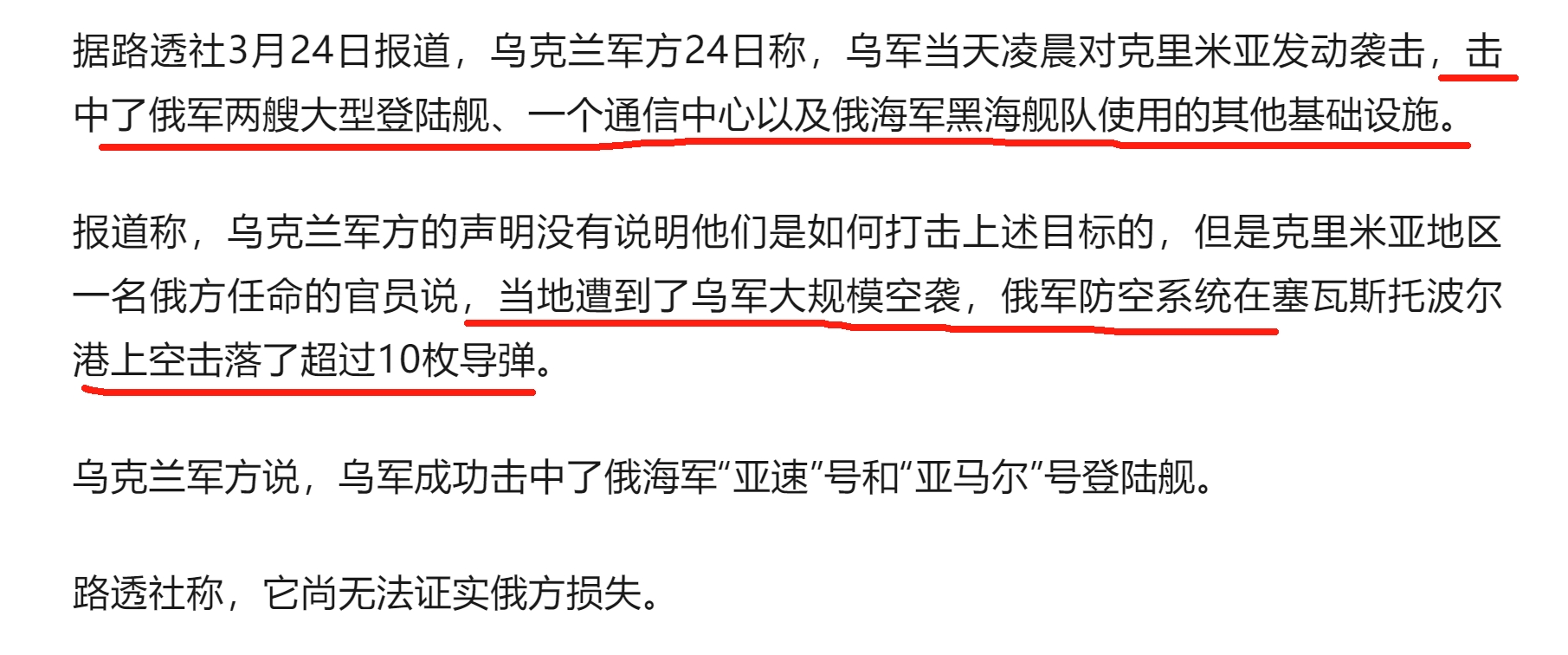 据参考消息援引路透社报道,乌克兰军方24日对克里米亚发起空袭,战果颇丰,包括击中俄罗斯黑海舰队的两艘大型登陆舰(亚马尔号和亚速号),以及黑海舰队其它基础设施。
