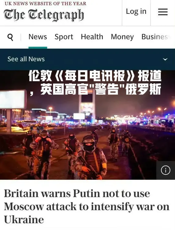 你凭什么断言"没关系"?昨天伦敦《每日电讯报》报道,有英国高官"警告"俄罗斯,不要把莫斯科遭到的恐怖袭击,与乌克兰联系起来,尤其不要把这种"虚幻的联系",作为升级俄乌冲突的理由。